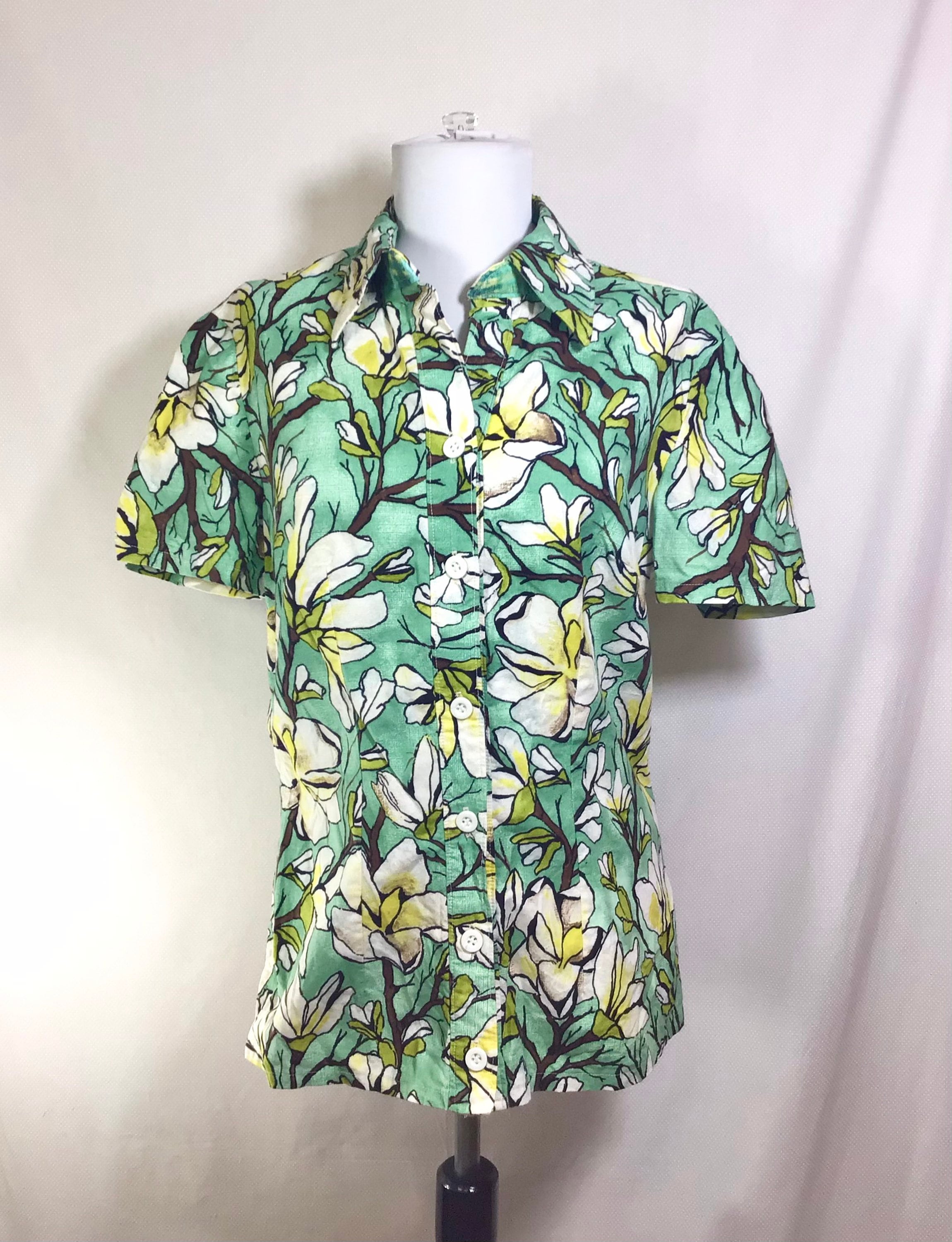 This shirt has a fun Hawaiian floral print with a color palette that consists of mint green, brown, white, black, and canary yellow. The shirt closes up the front with 6 white buttons, and there are slits at the side waist for a comfortable, flattering fit. It would be perfect for vacation, and looks great with shorts, jeans, and skirts!