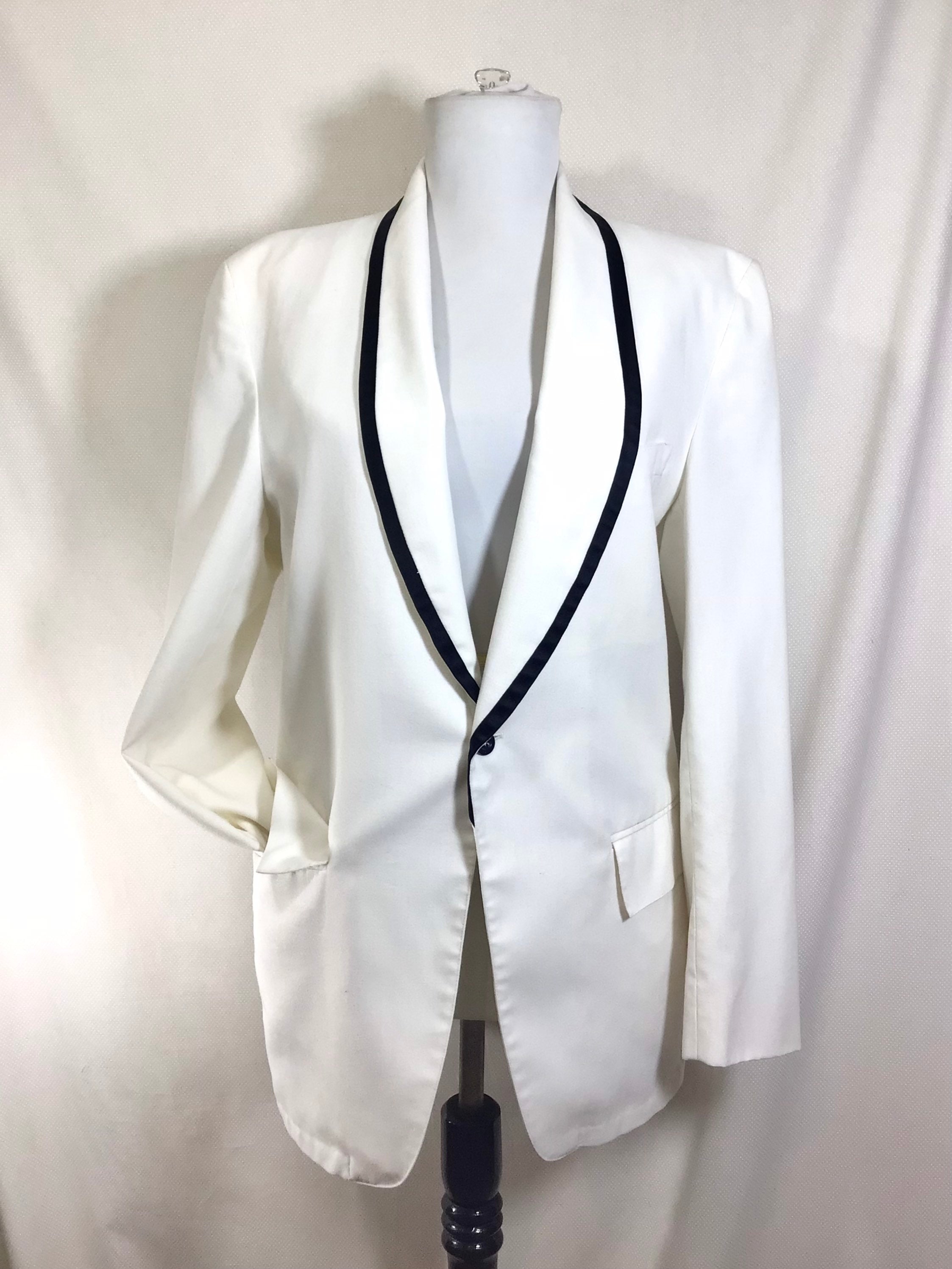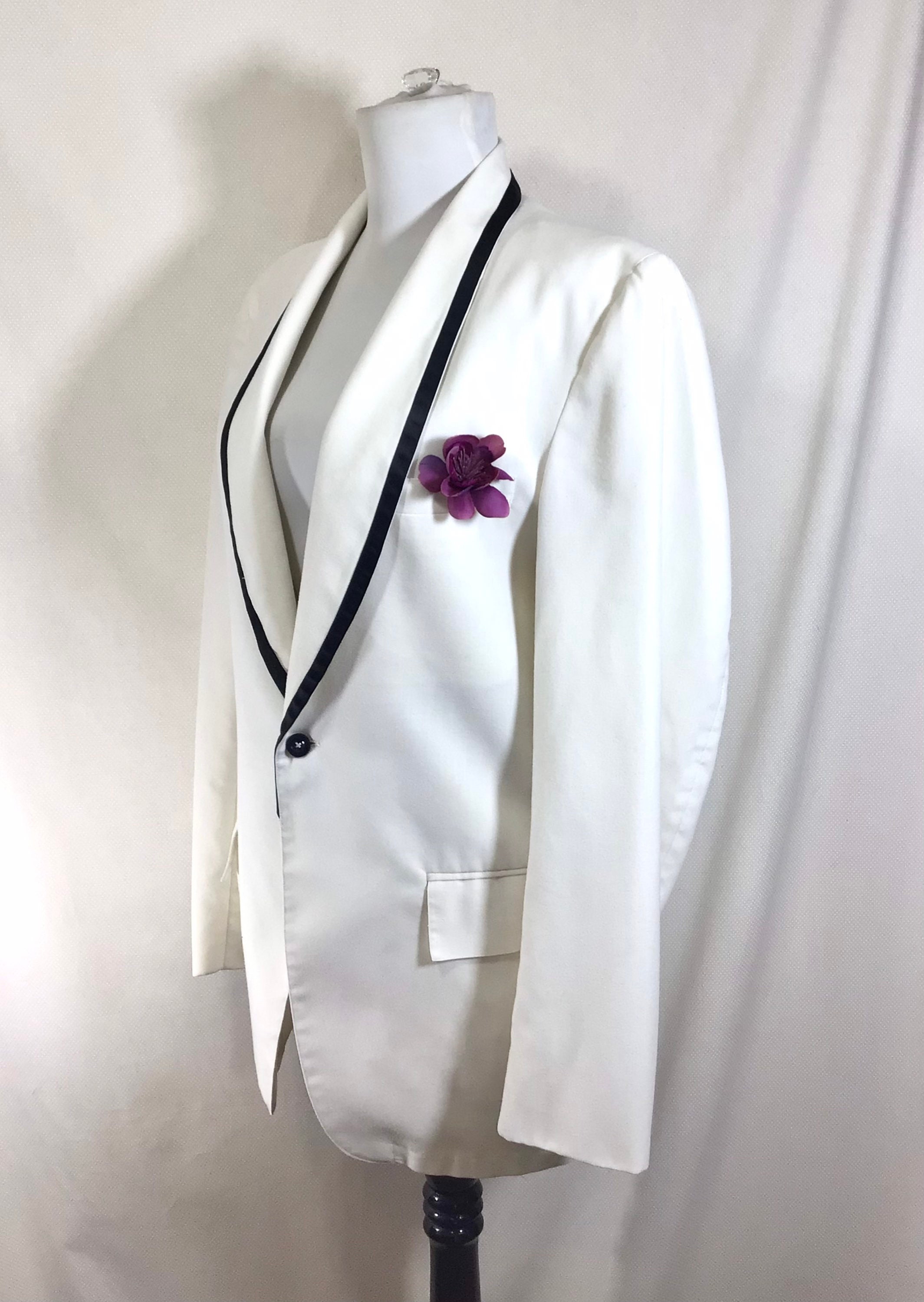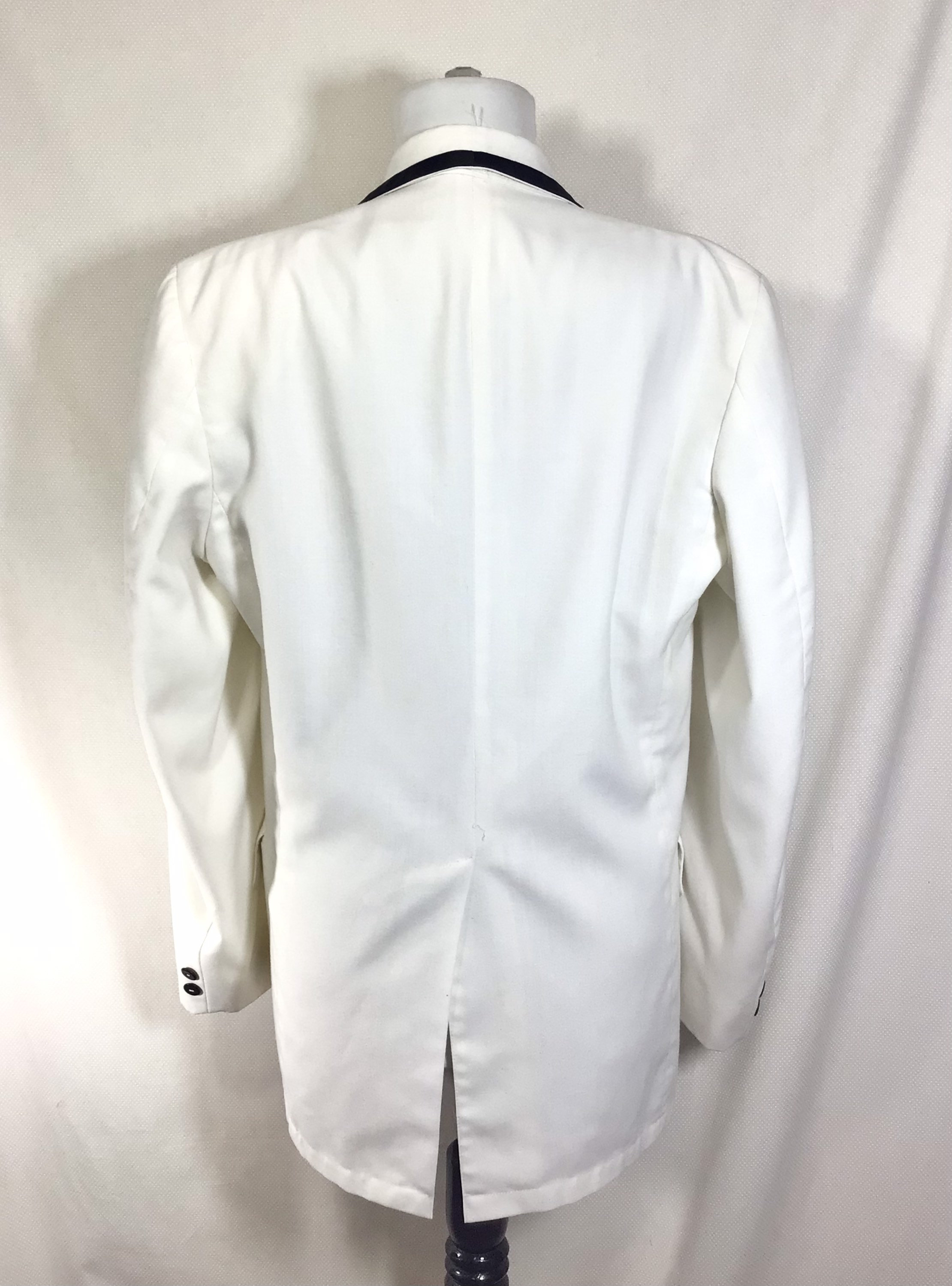 This jacket is very versatile and is appropriate for several occasions! There is black satin trim along the lapels, and it closes with a single button. There are 3 functional pockets, one at each hip, and a handkerchief pocket on the left breast. There is also a slit in the back of the jacket for flexibility and comfort.