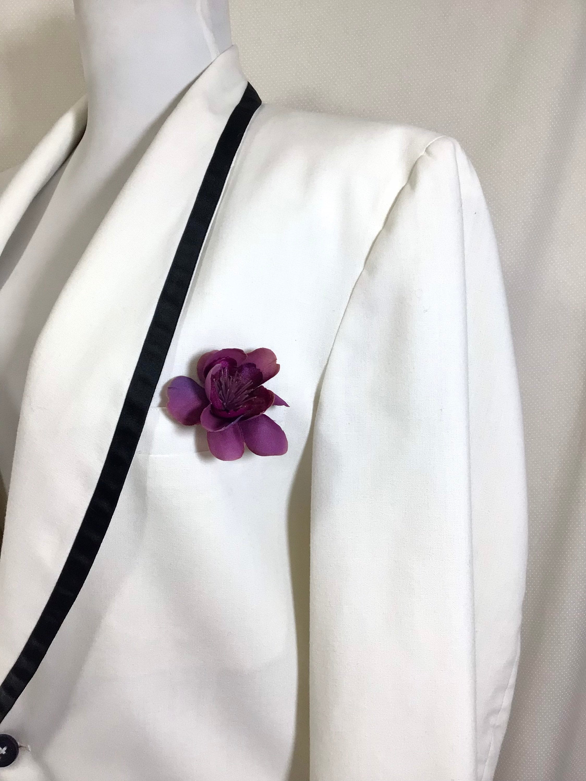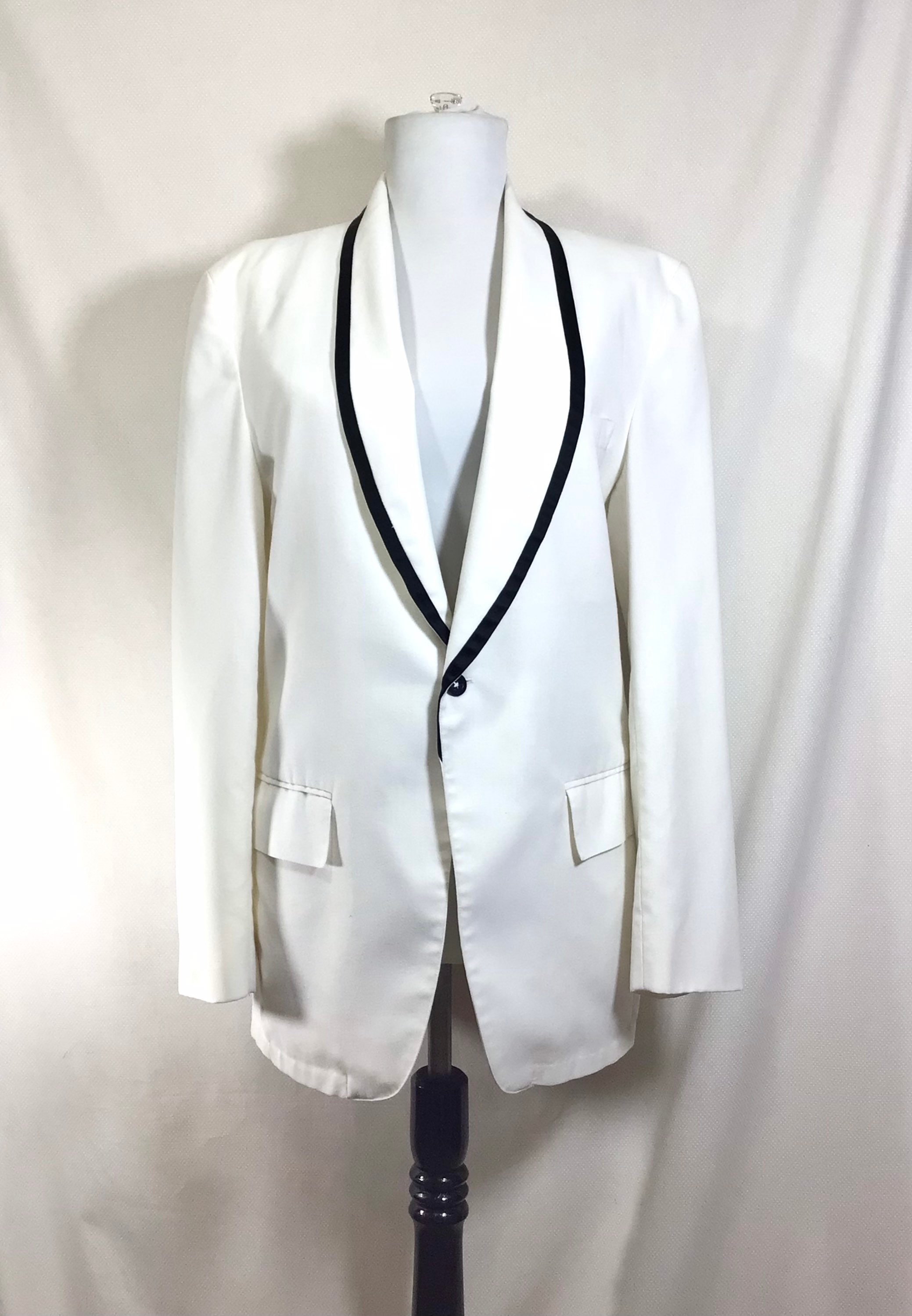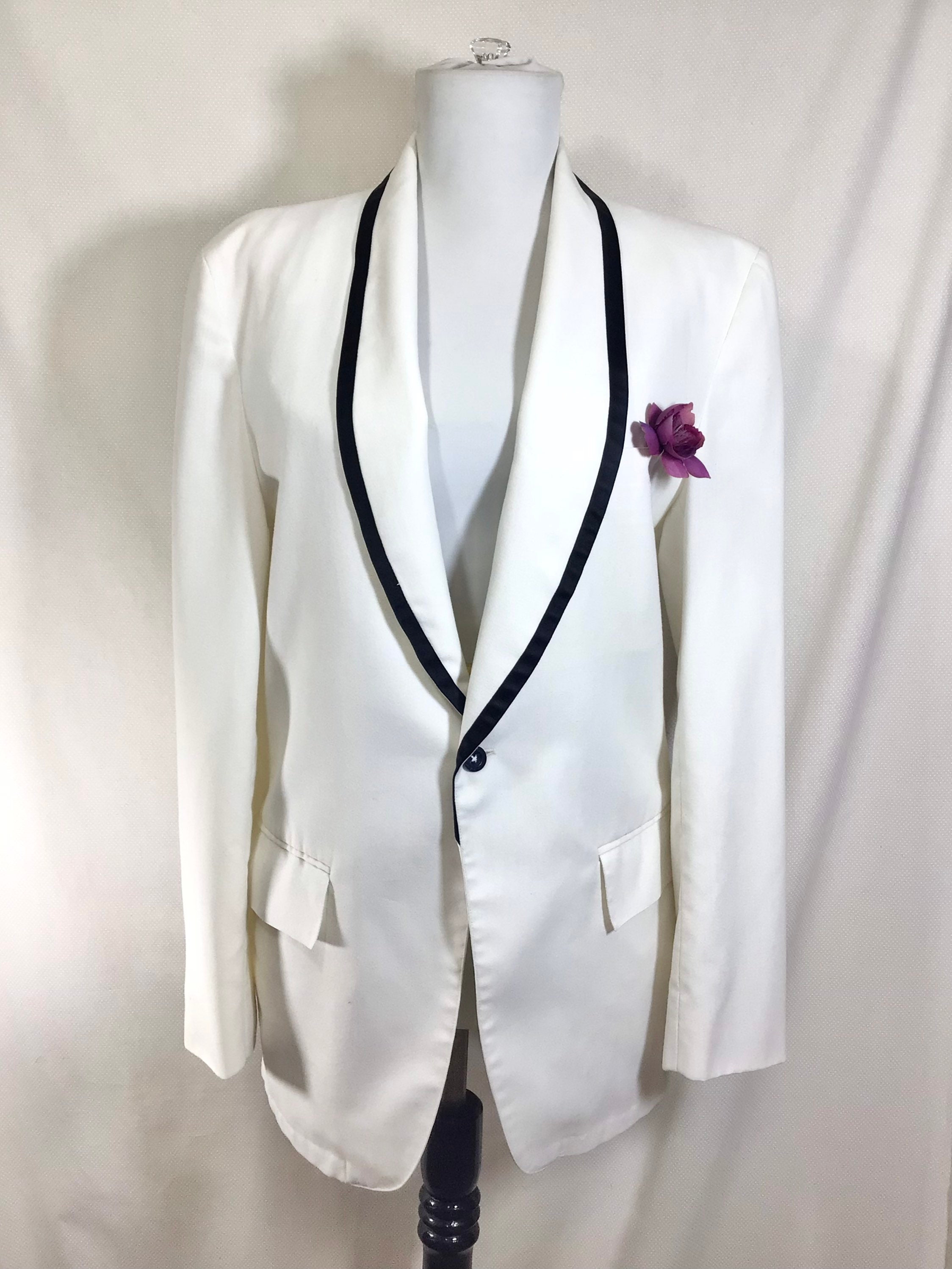 This jacket is very versatile and is appropriate for several occasions! There is black satin trim along the lapels, and it closes with a single button. There are 3 functional pockets, one at each hip, and a handkerchief pocket on the left breast. There is also a slit in the back of the jacket for flexibility and comfort.