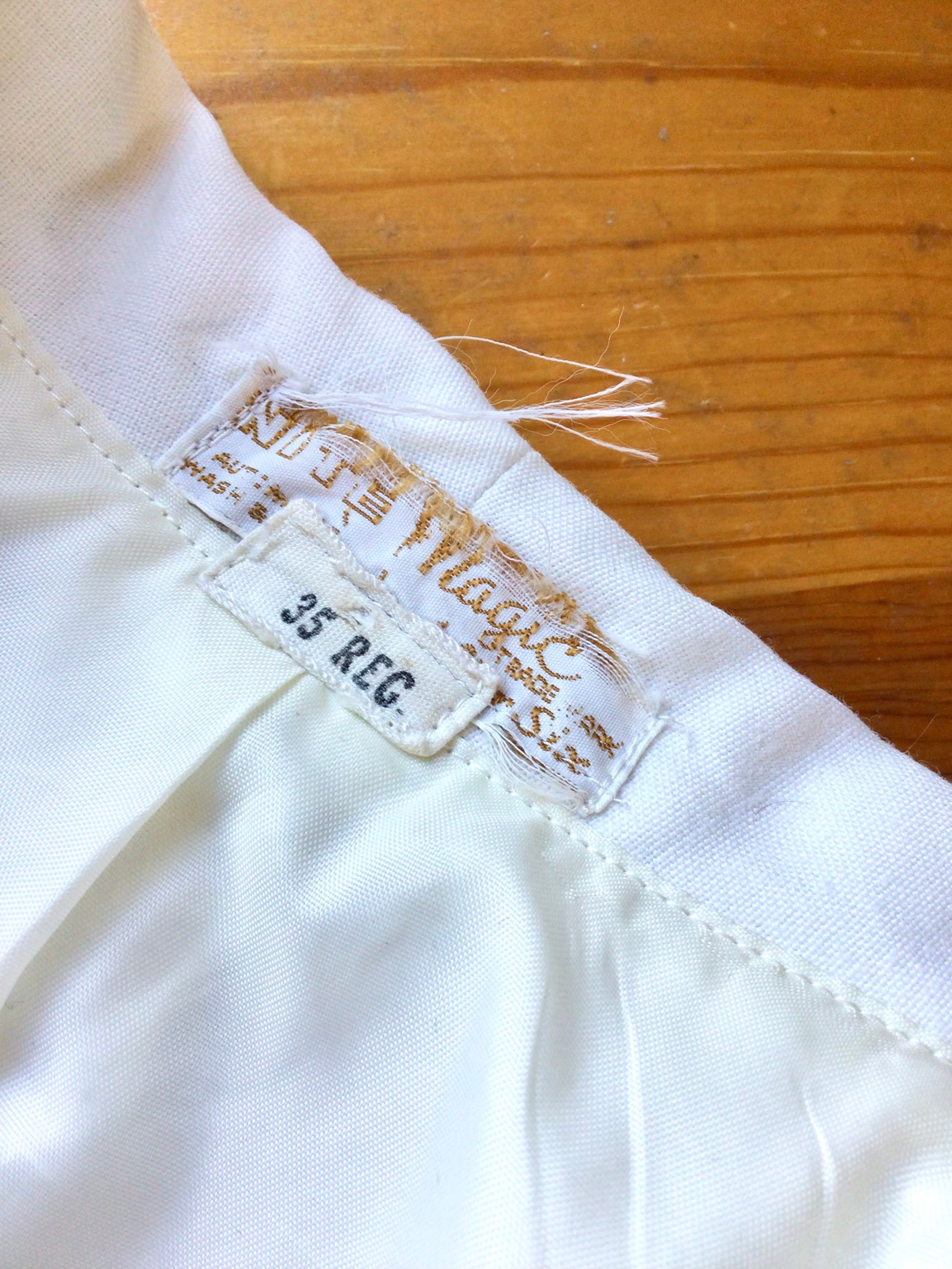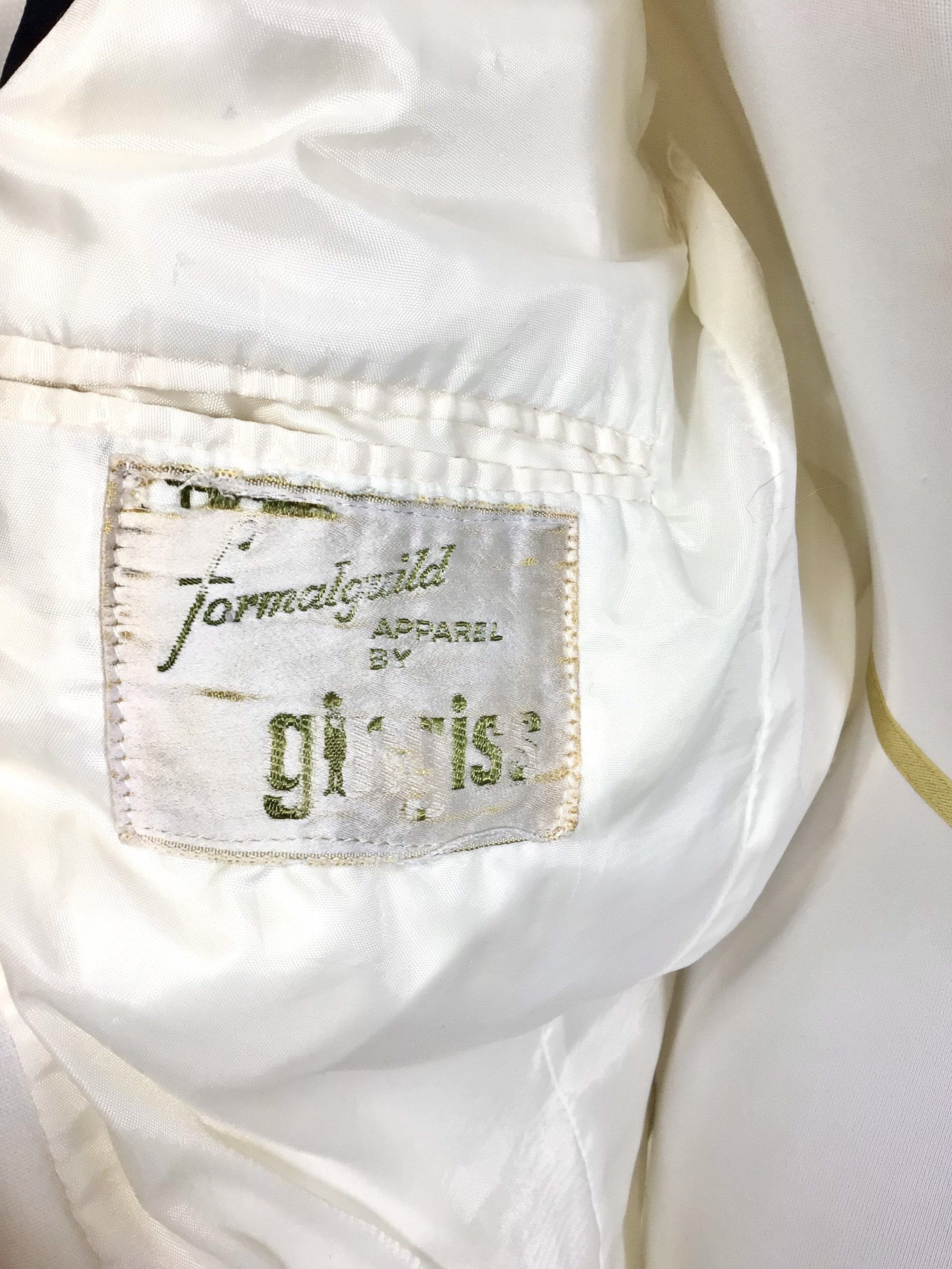 This “Nite Magic” formal suit jacket was made during the early 1960s by “After Six”. It is made of a lightweight, white linen fabric and lined with silk. It is marked as a size 35, but please see measurements below to guarantee fit. (Photographed on female size 4 mannequin.)