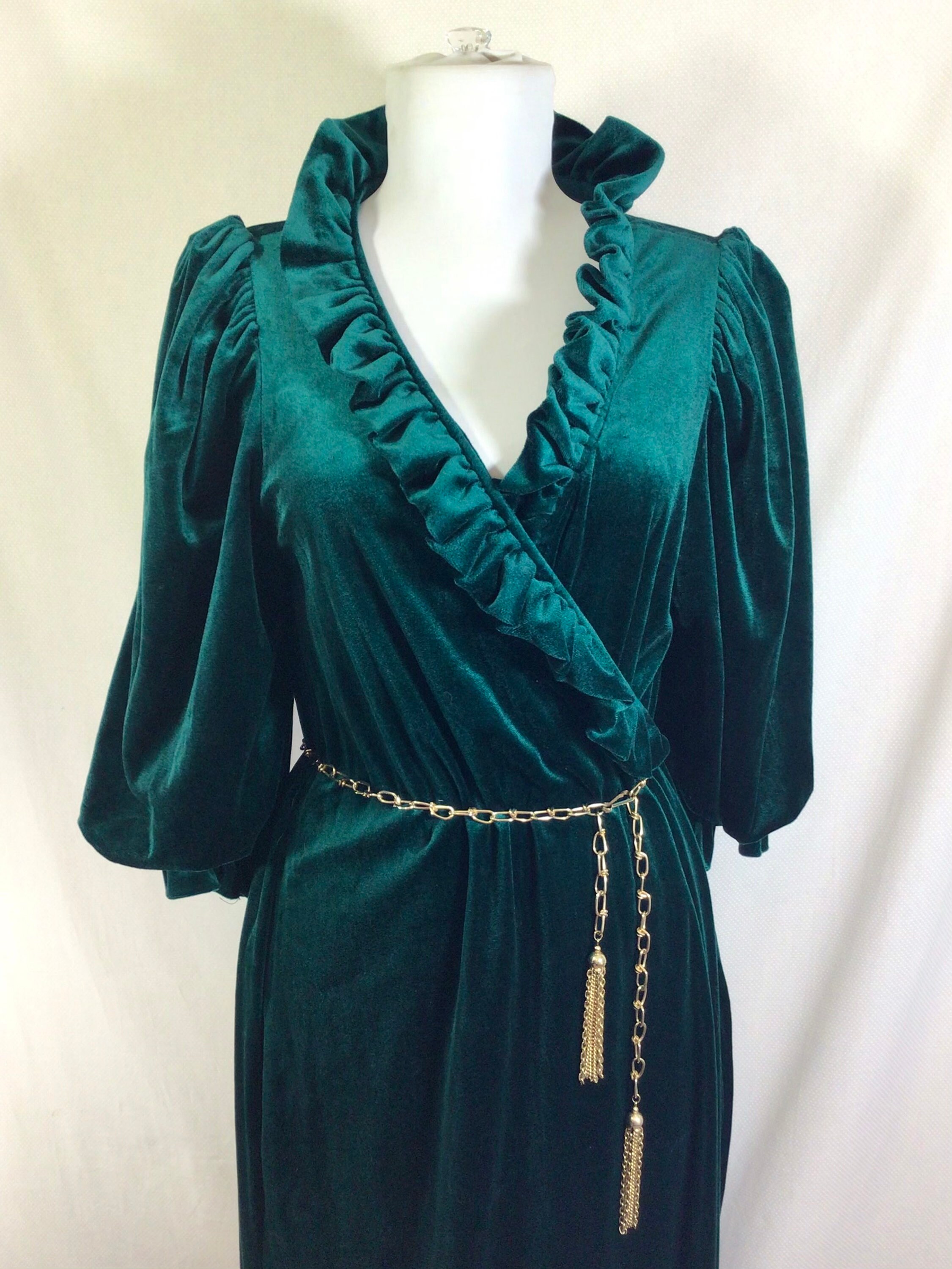 The emerald green color of this robe is so glamorous, it could totally pass as a wrap dress or duster, or you could just wear it around your home! It has POCKETS and comes with a matching velvet belt that ties at the waist, or you can pair it with a statement belt like in the photos. The robe has a 1940’s inspired vibe to it, with puff sleeves and a deep v-neck and ruffled collar. There is a tie on the inside bodice to secure the front closed.