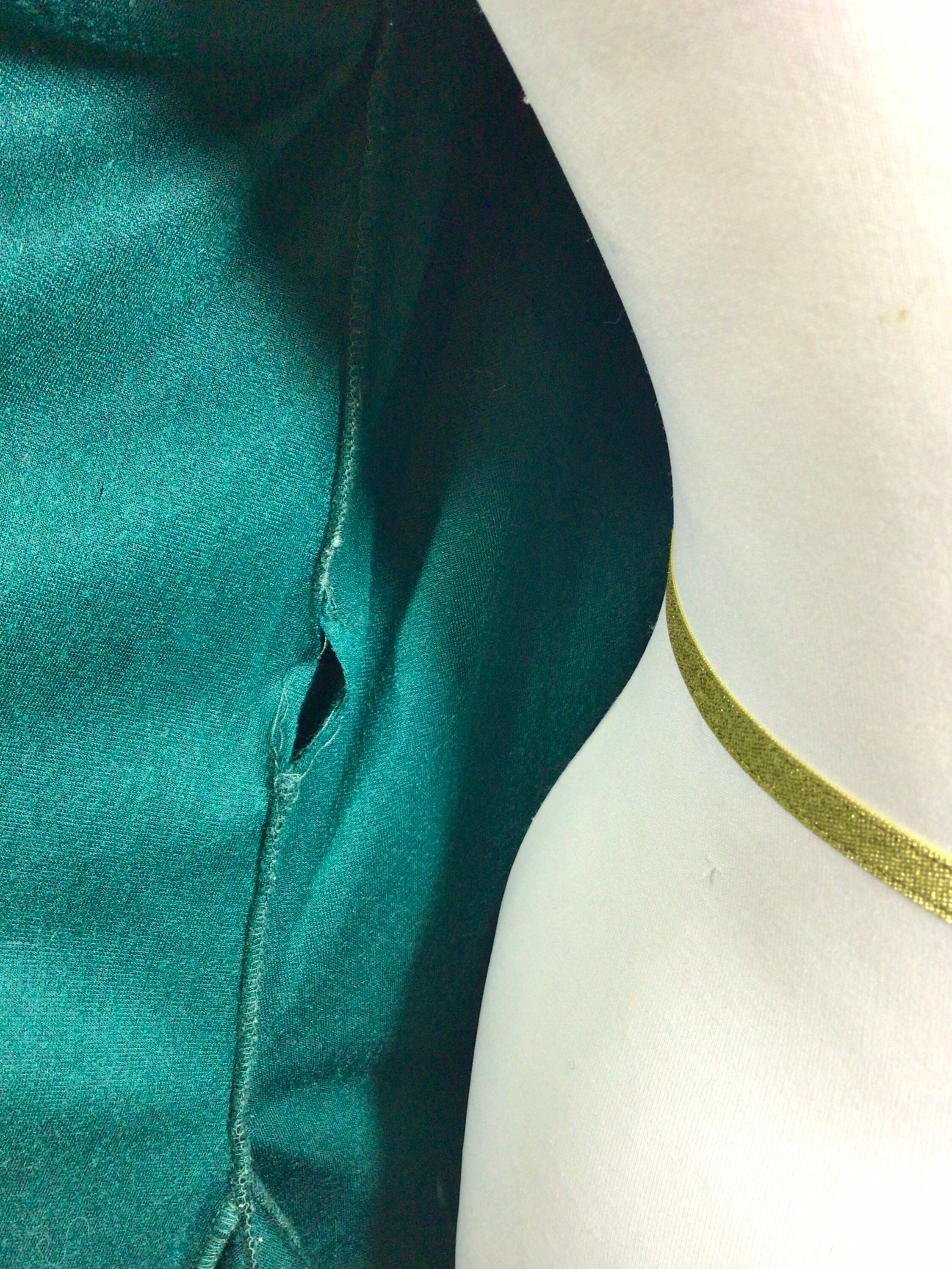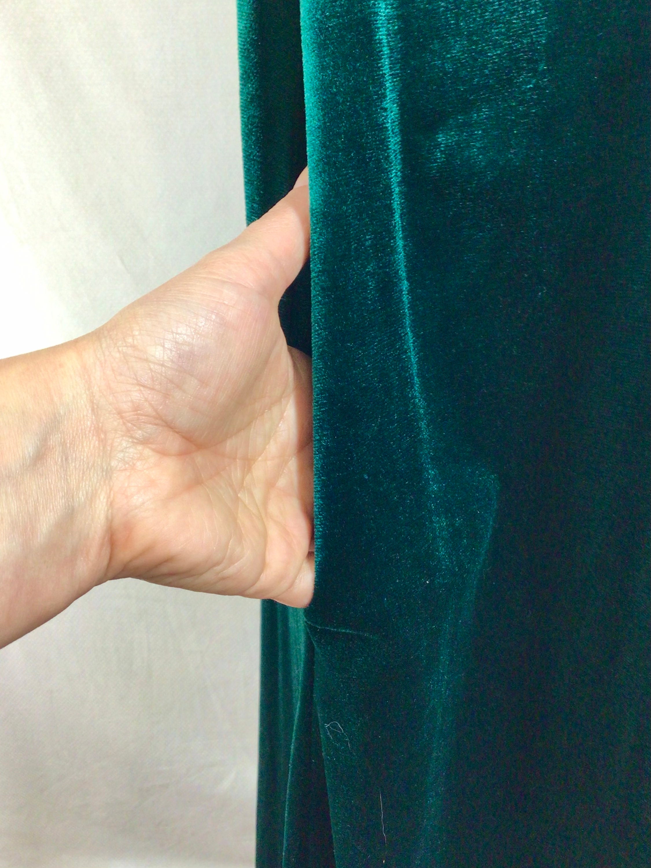 This robe was made during the 1970s by “Miss Elaine”. It is constructed from machine-washable semi-stretch velvet fabric with a soft mesh lining in the sleeves. There is no size indicated as the tag was removed, but it would best fit a modern size small. Please see measurements below to guarantee fit.