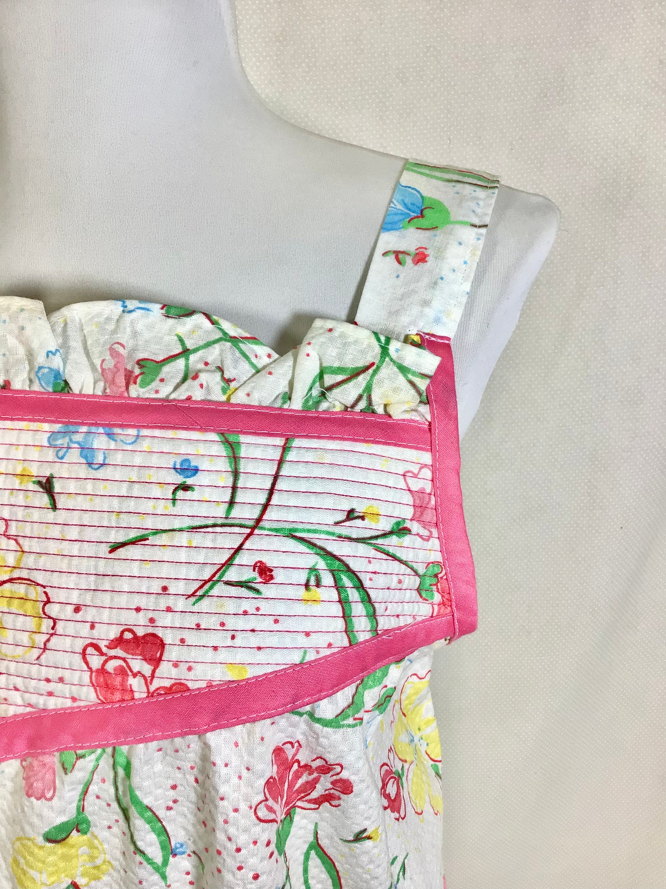 The pretty floral print on this dress is accented by some lovely construction details such as a quilted yoke at the neckline with pink trim, and ruffles at the neck and hemline. The fabric itself has a light waffled texture and is very breathable for warm weather, and elastic on the back of the bodice allows for easy movement.