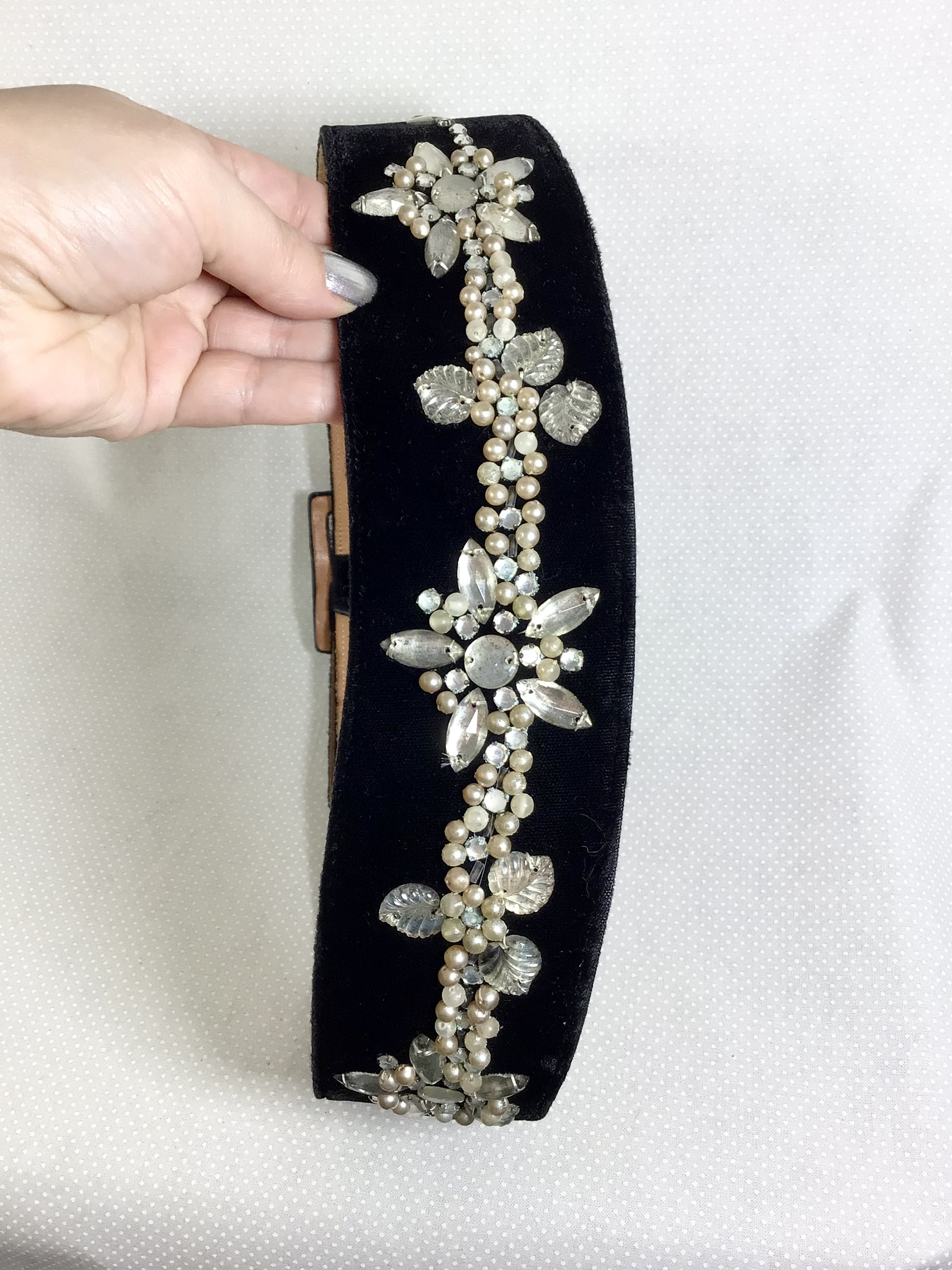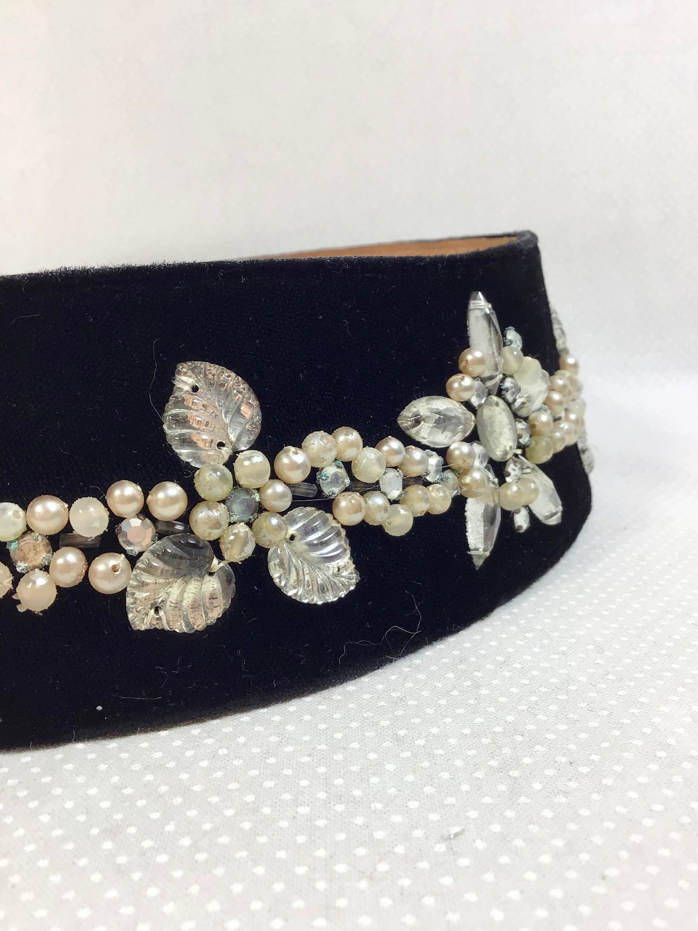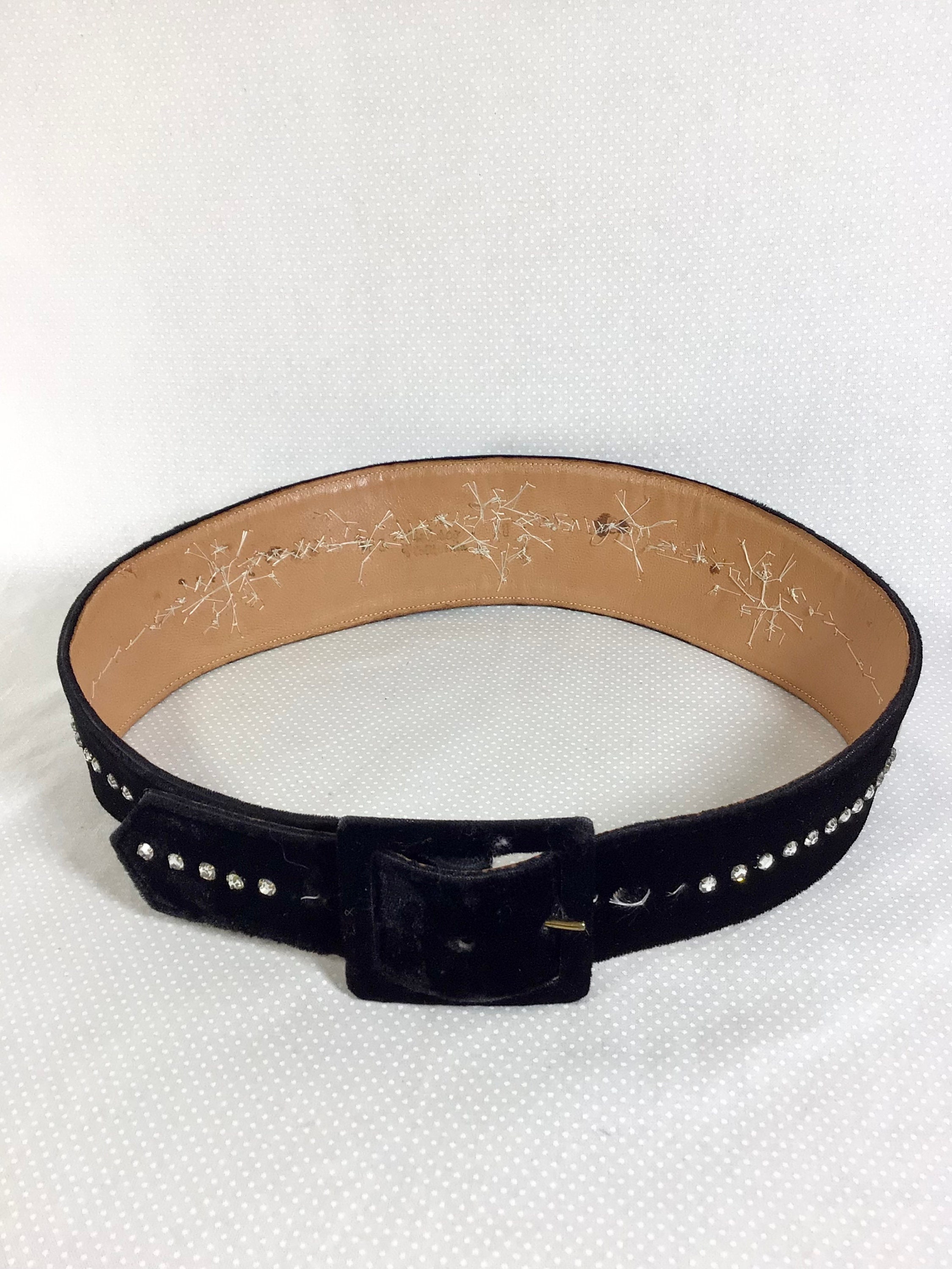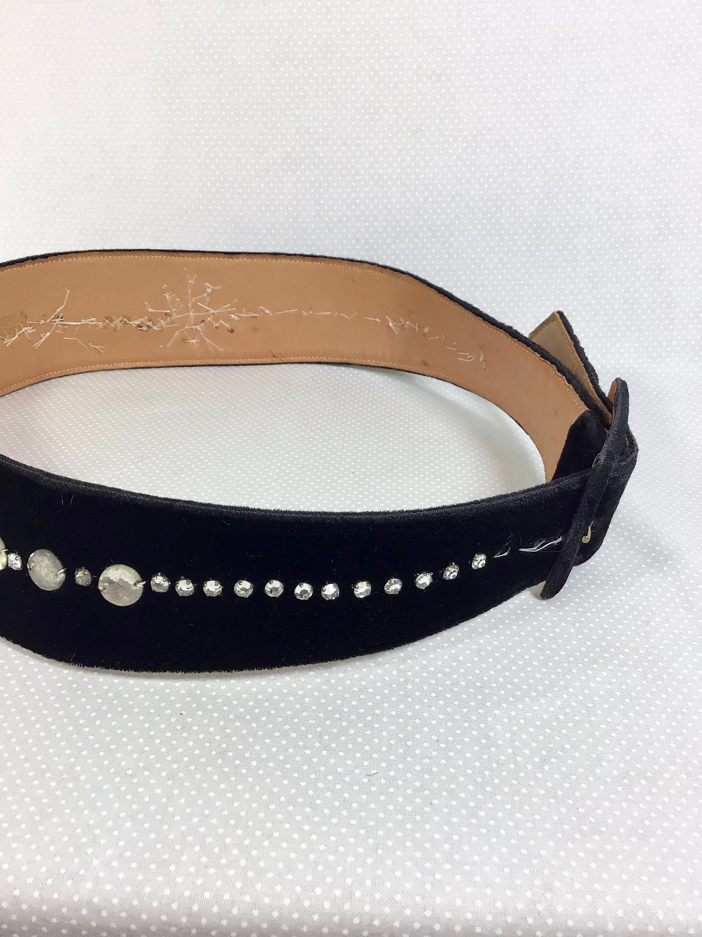 This 1940s belt is made of genuine leather and black velvet fabric, and it would best fit waist sizes 26-29 inches. It has been modified by the previous owner with sparkling rhinestone embellishments, shimmery translucent beads, and tiny faux pearls.