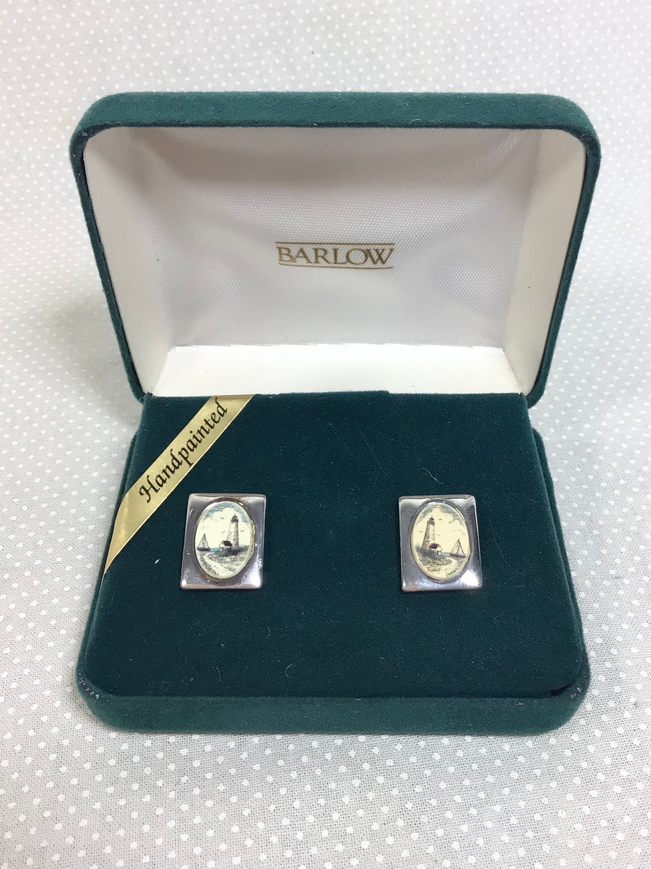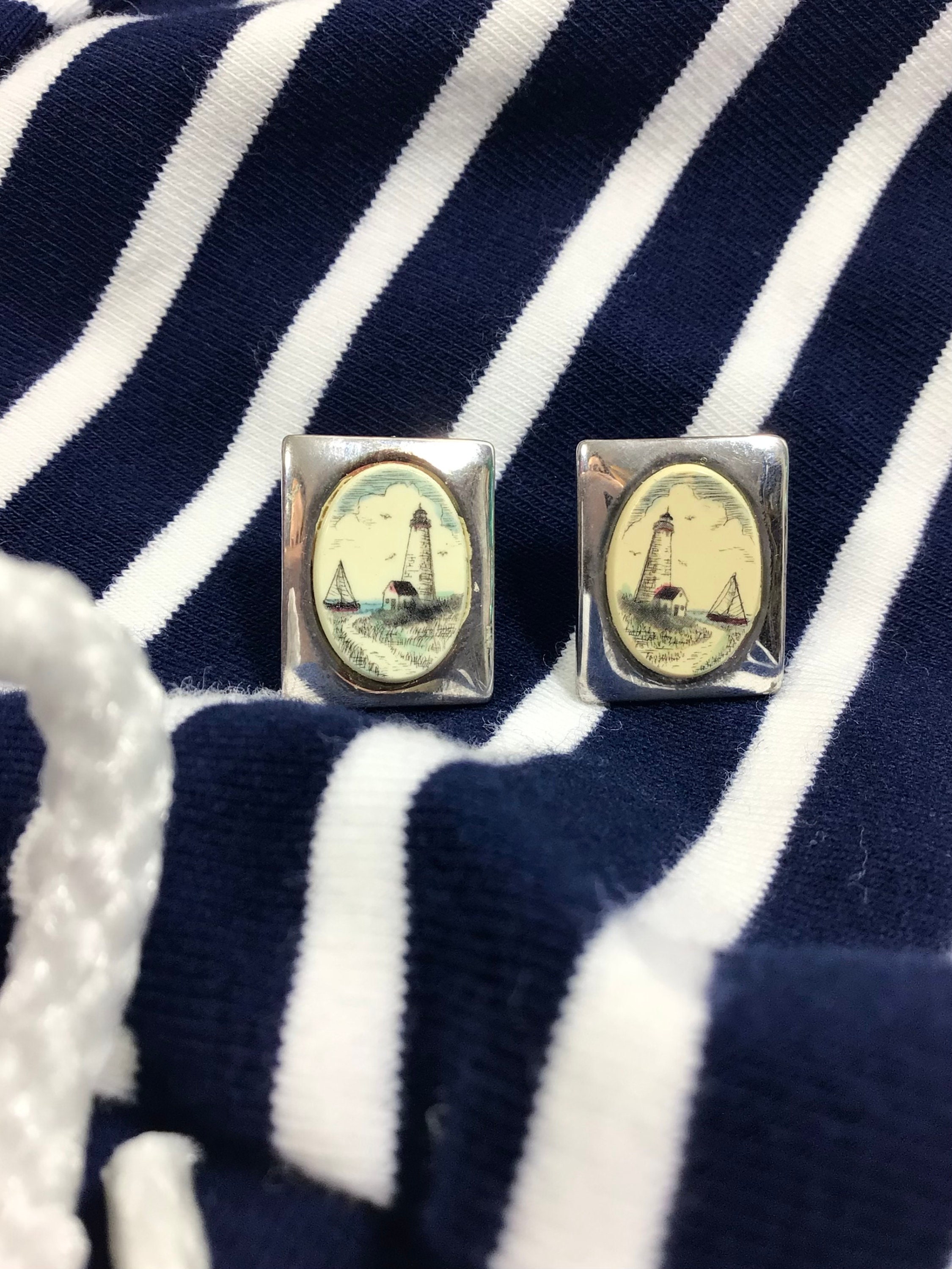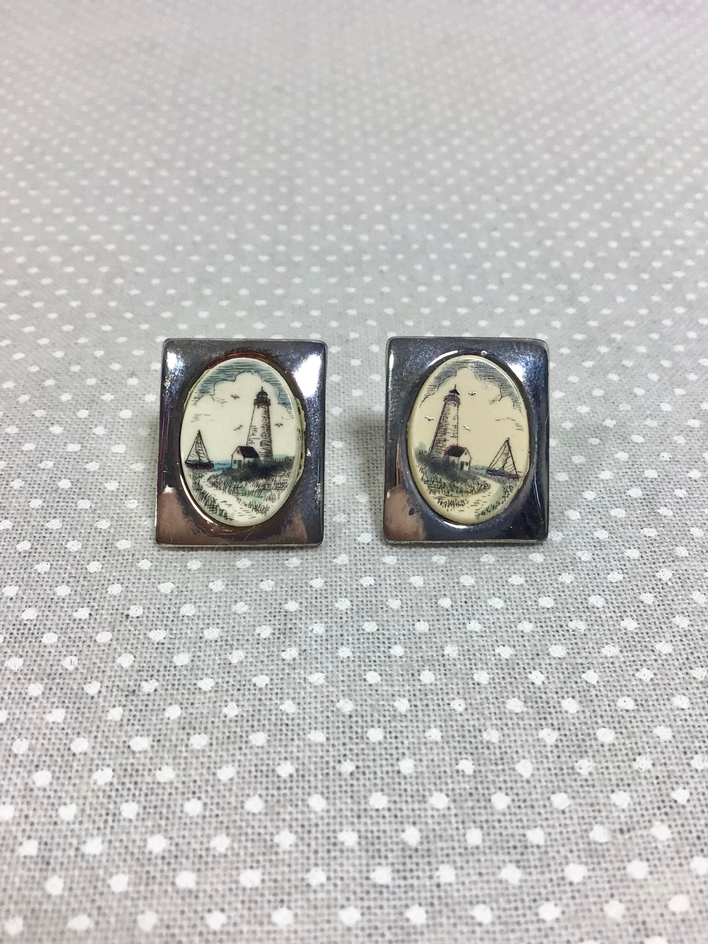This pair of signed earrings are by “Barlow”. They are silver plated with the most adorable hand painted lighthouse seascapes on bone.