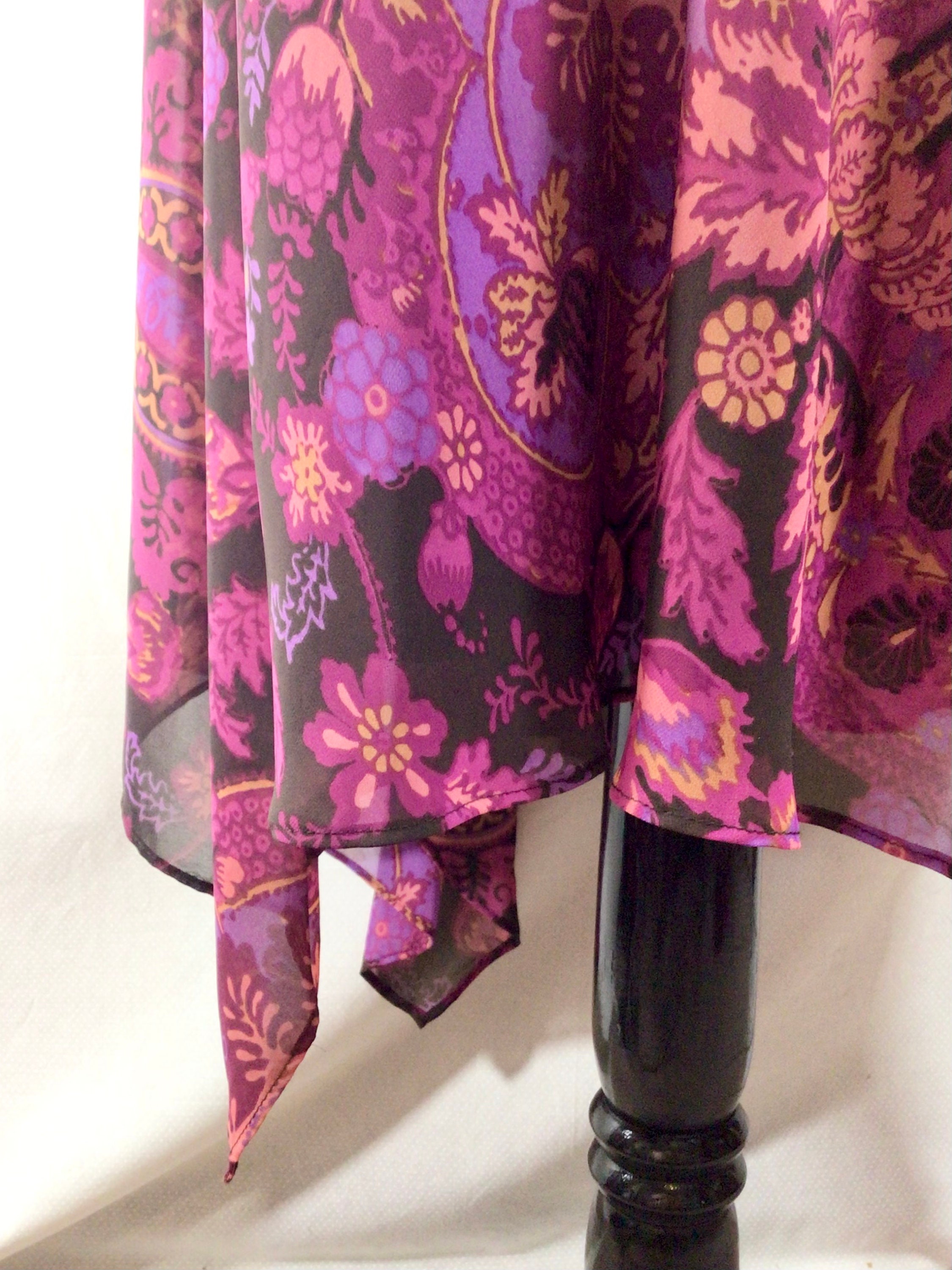 The magenta paisley print on this skirt is so dreamy! It has a lovely asymmetrical hem that is very flowy and shows off movement nicely. True to the times, this skirt has a low-rise waistline, however it could be worn higher up on the waist (depending on your measurements). The skirt closes with a zipper at the side waist and has a rich brown lining underneath.