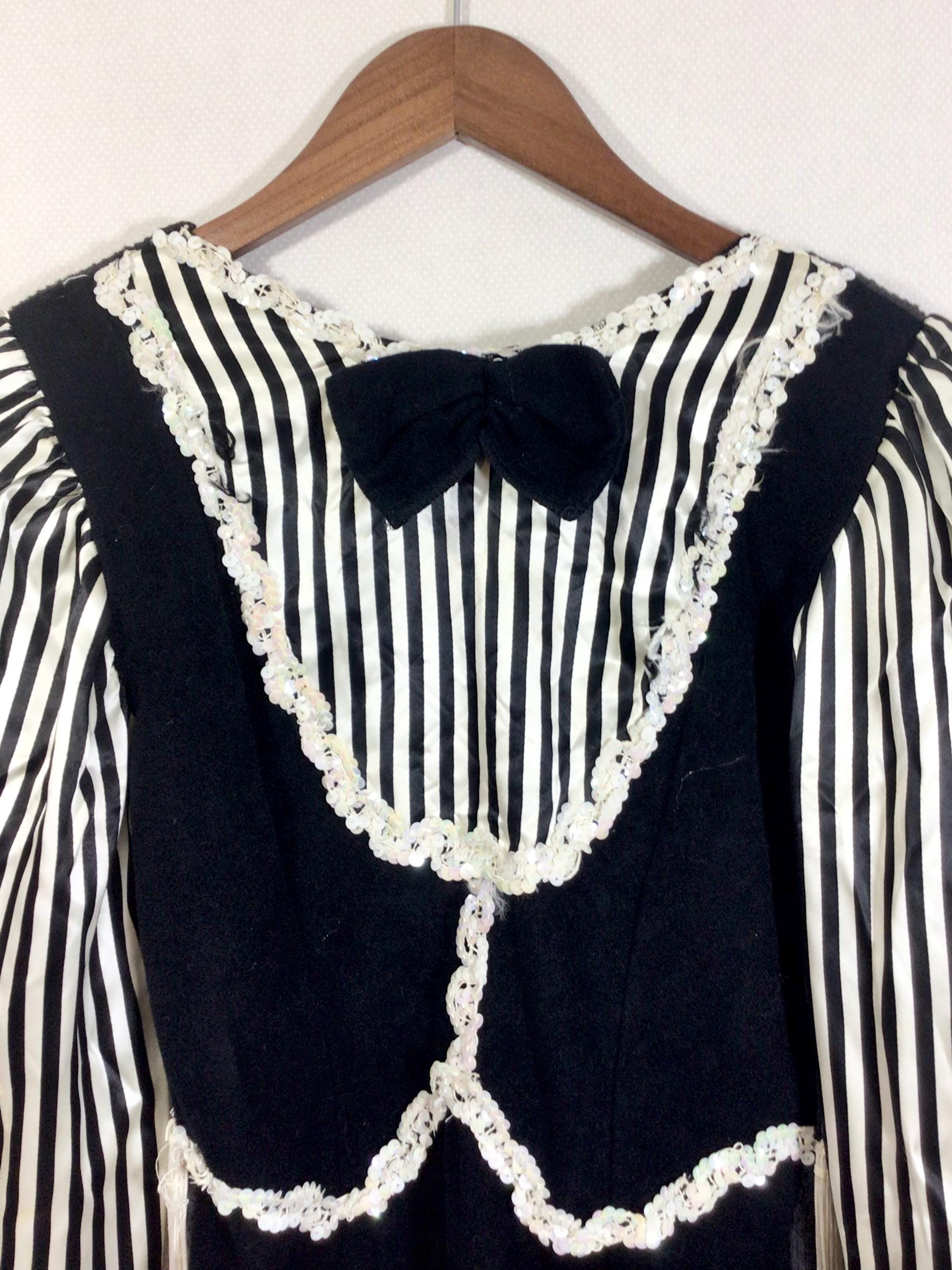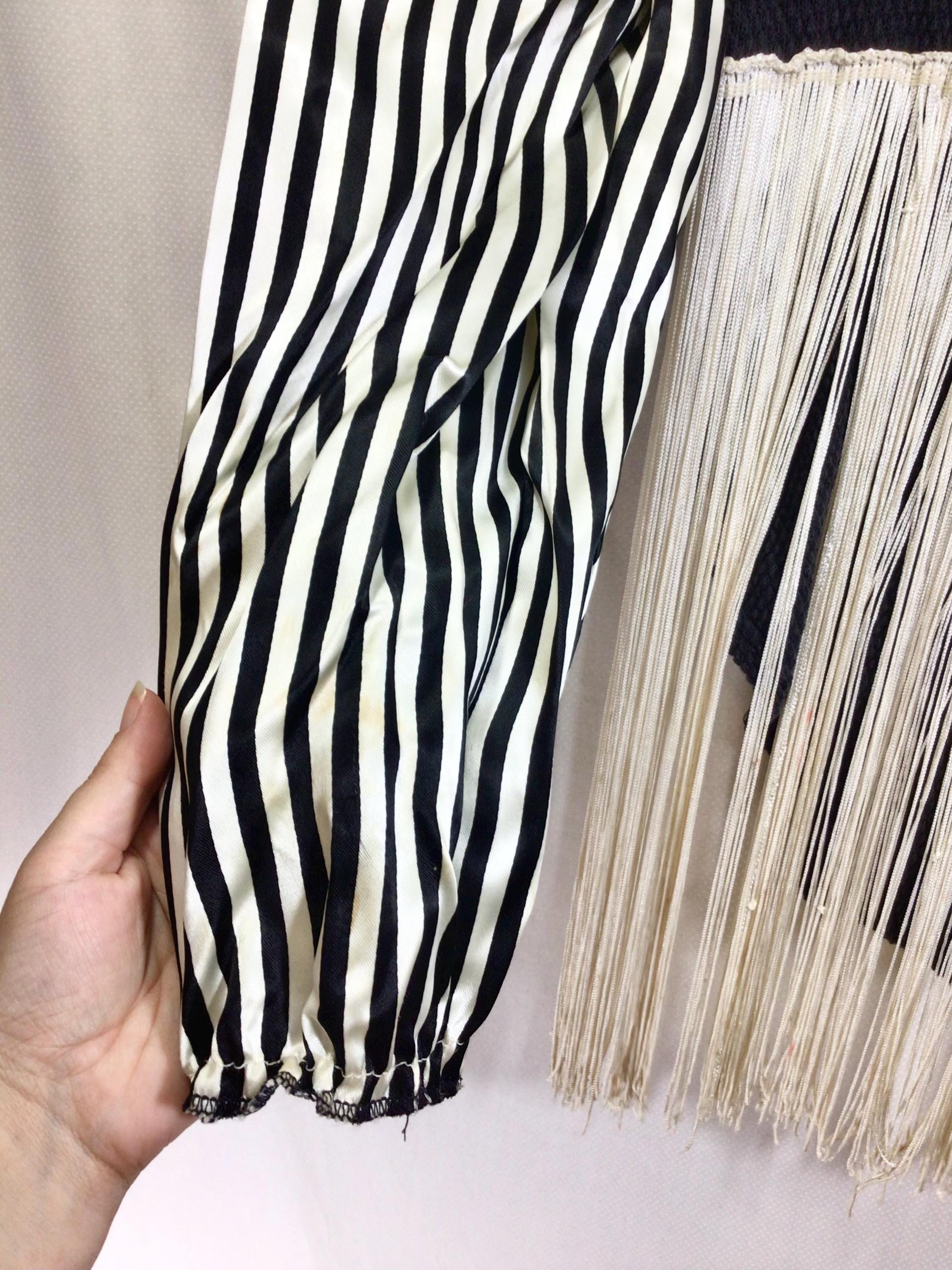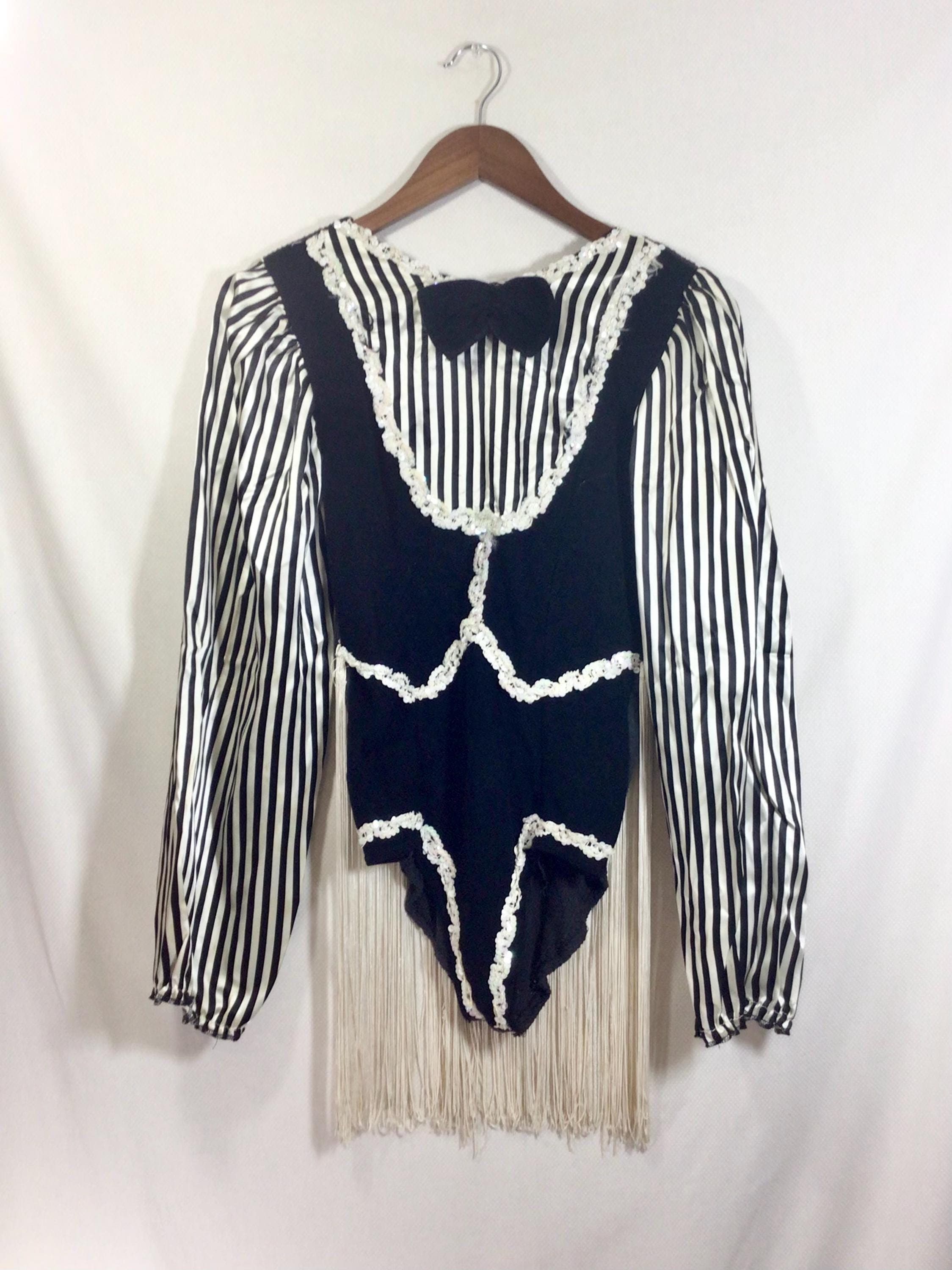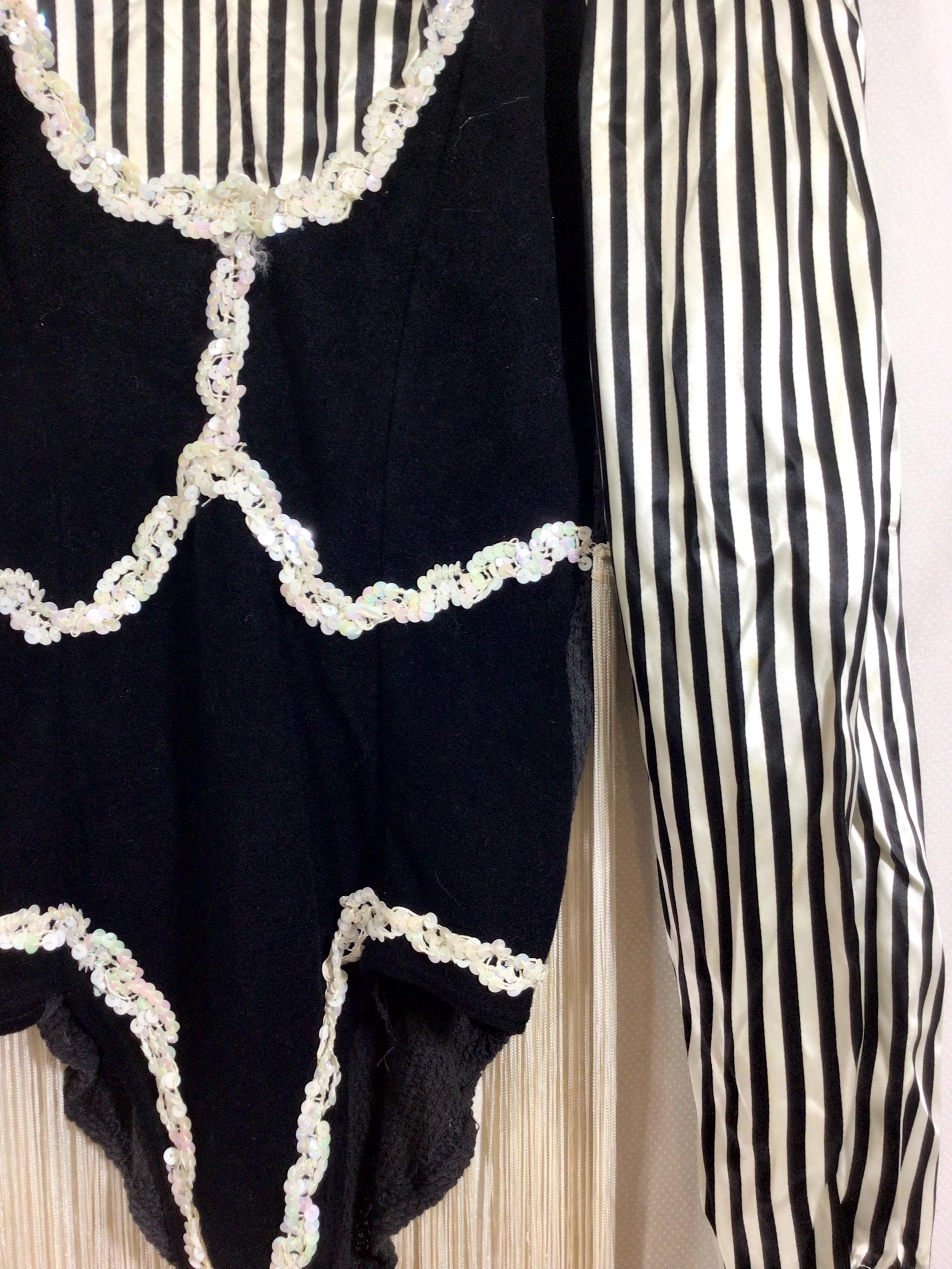 The front of the leotard has an amazing black and white striped bib neckline with the cutest little bowtie! The striped fabric continues on the sleeves, while the contrasting fringe shows off movement in a playful way. This would be an excellent piece for a Halloween/Theater/Burlesque costume, or simply for display!