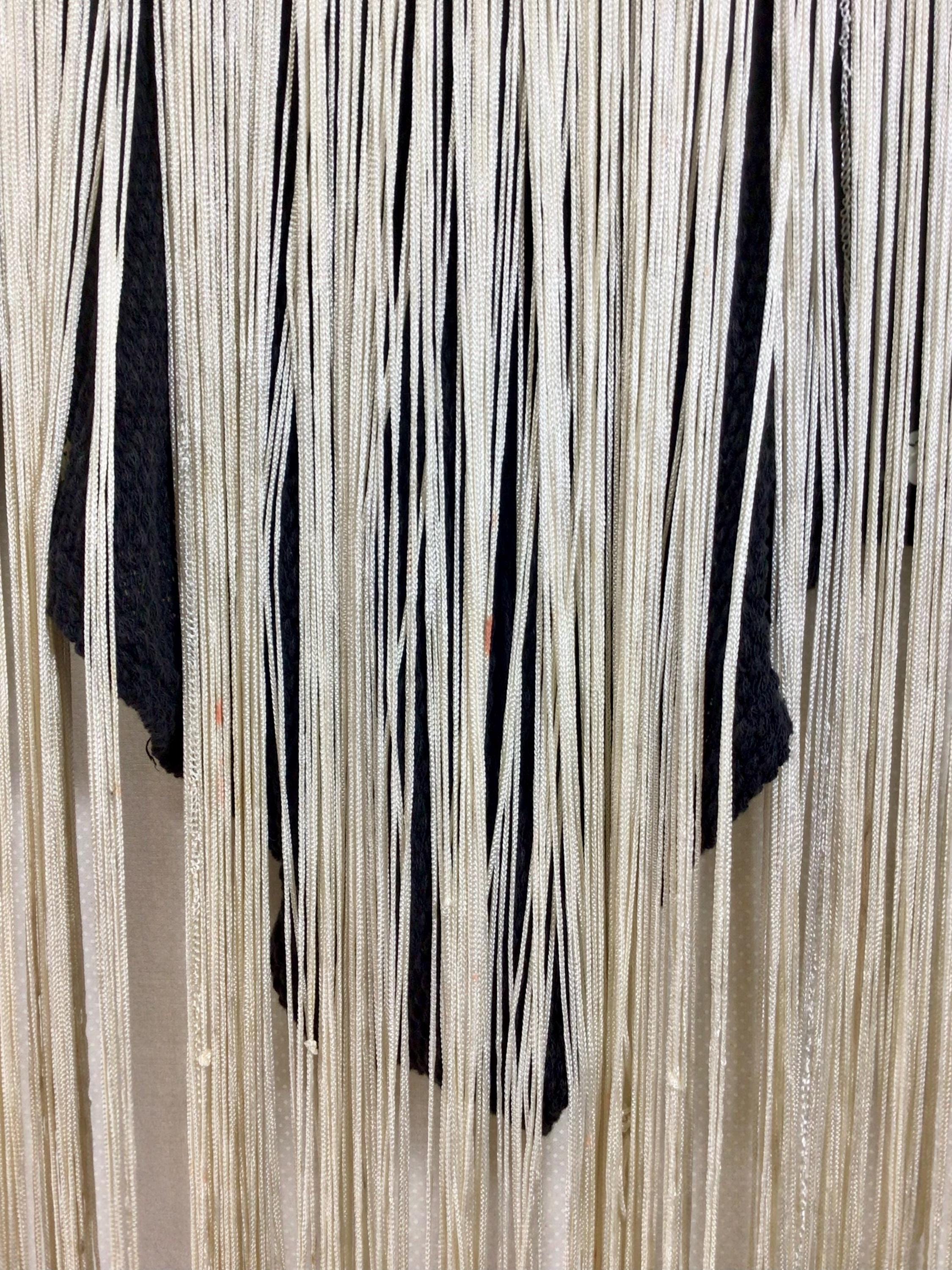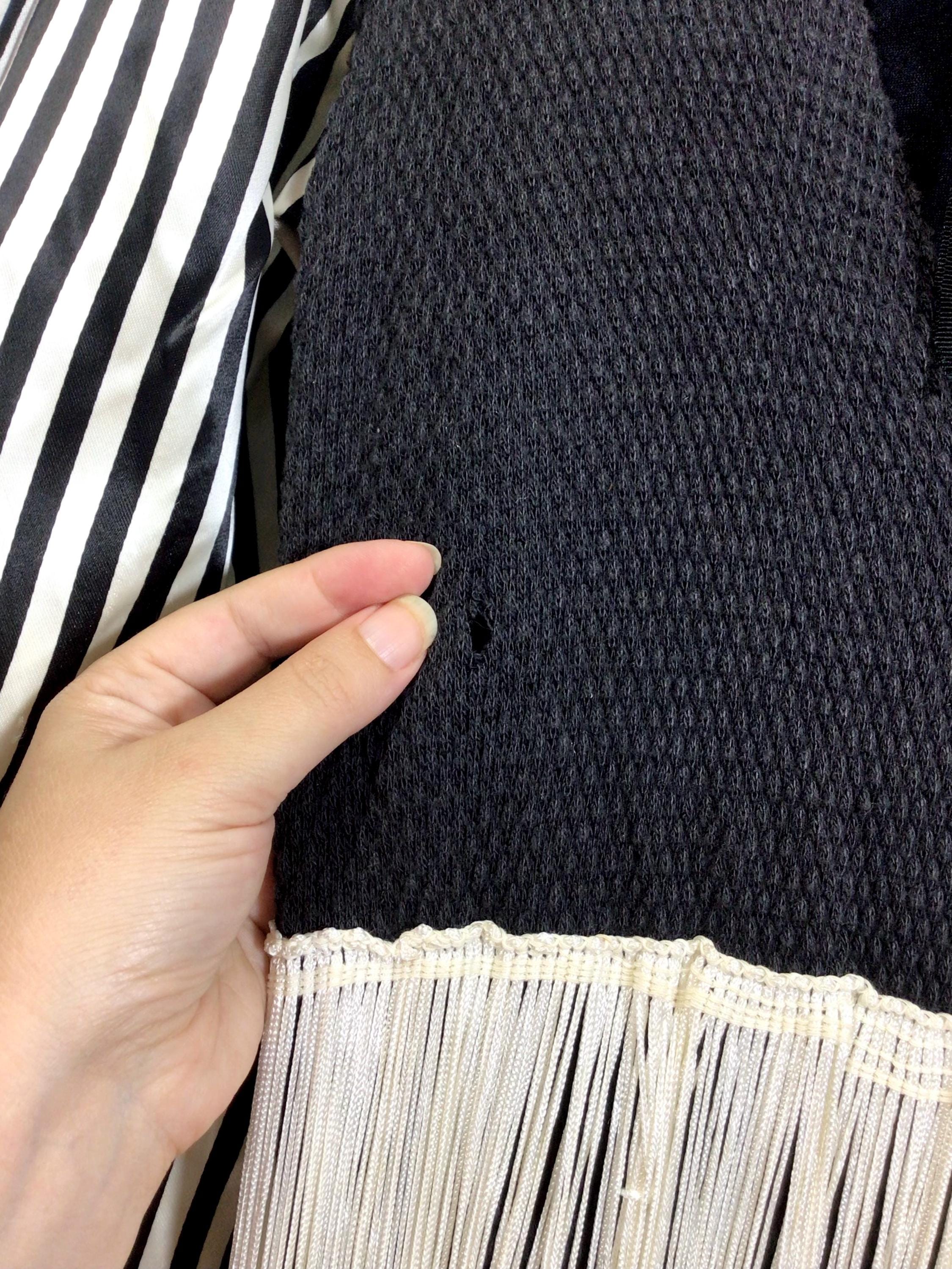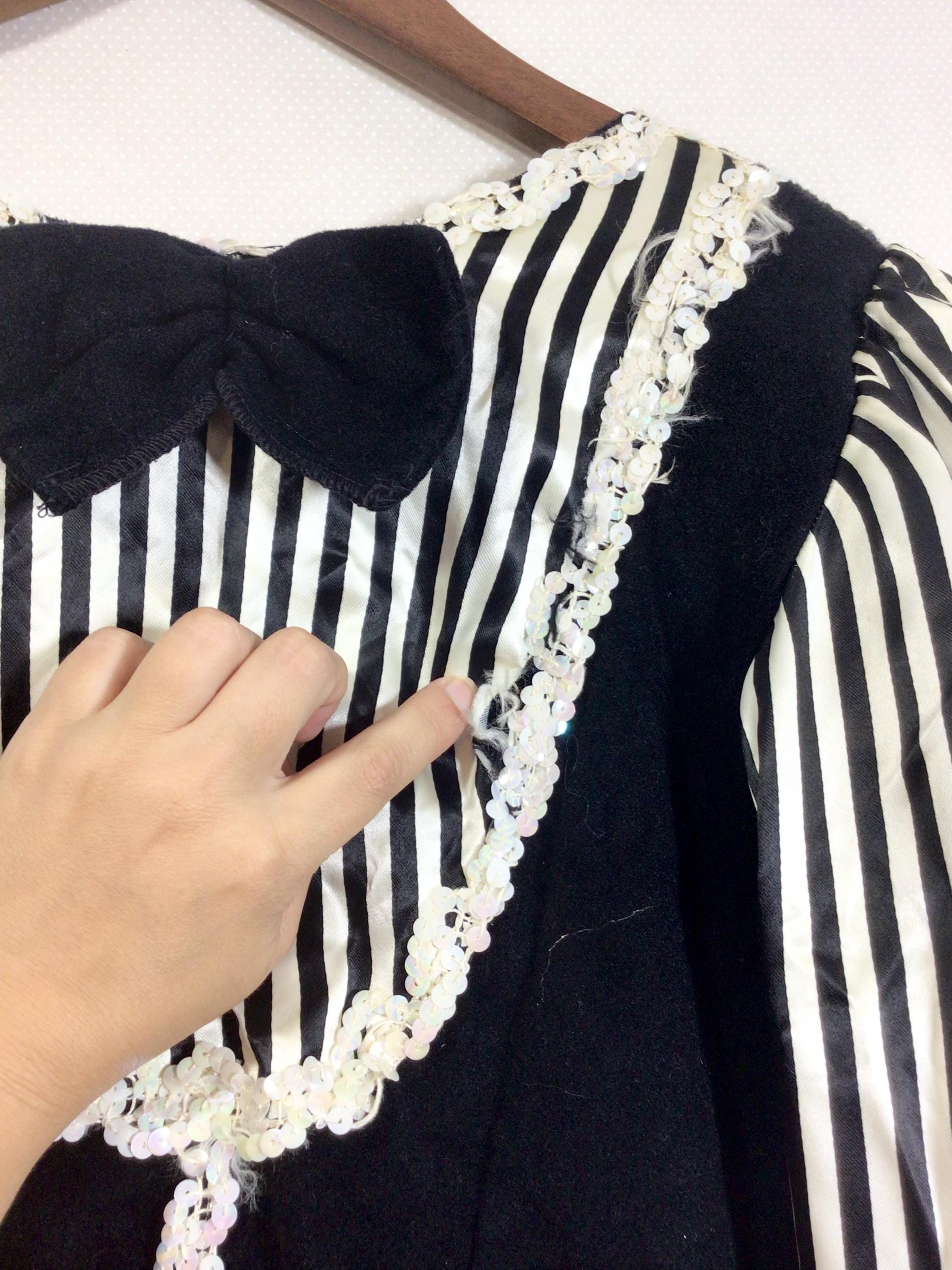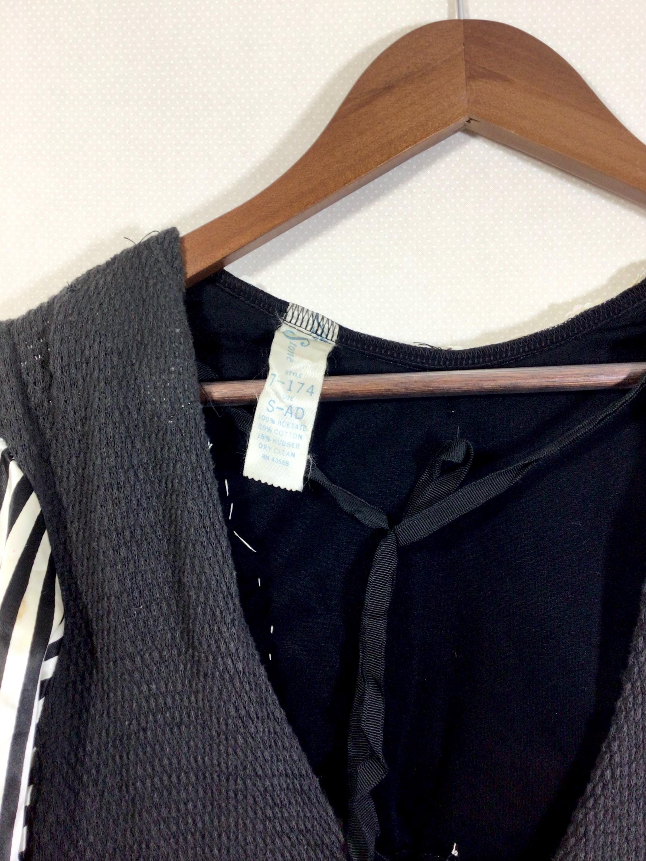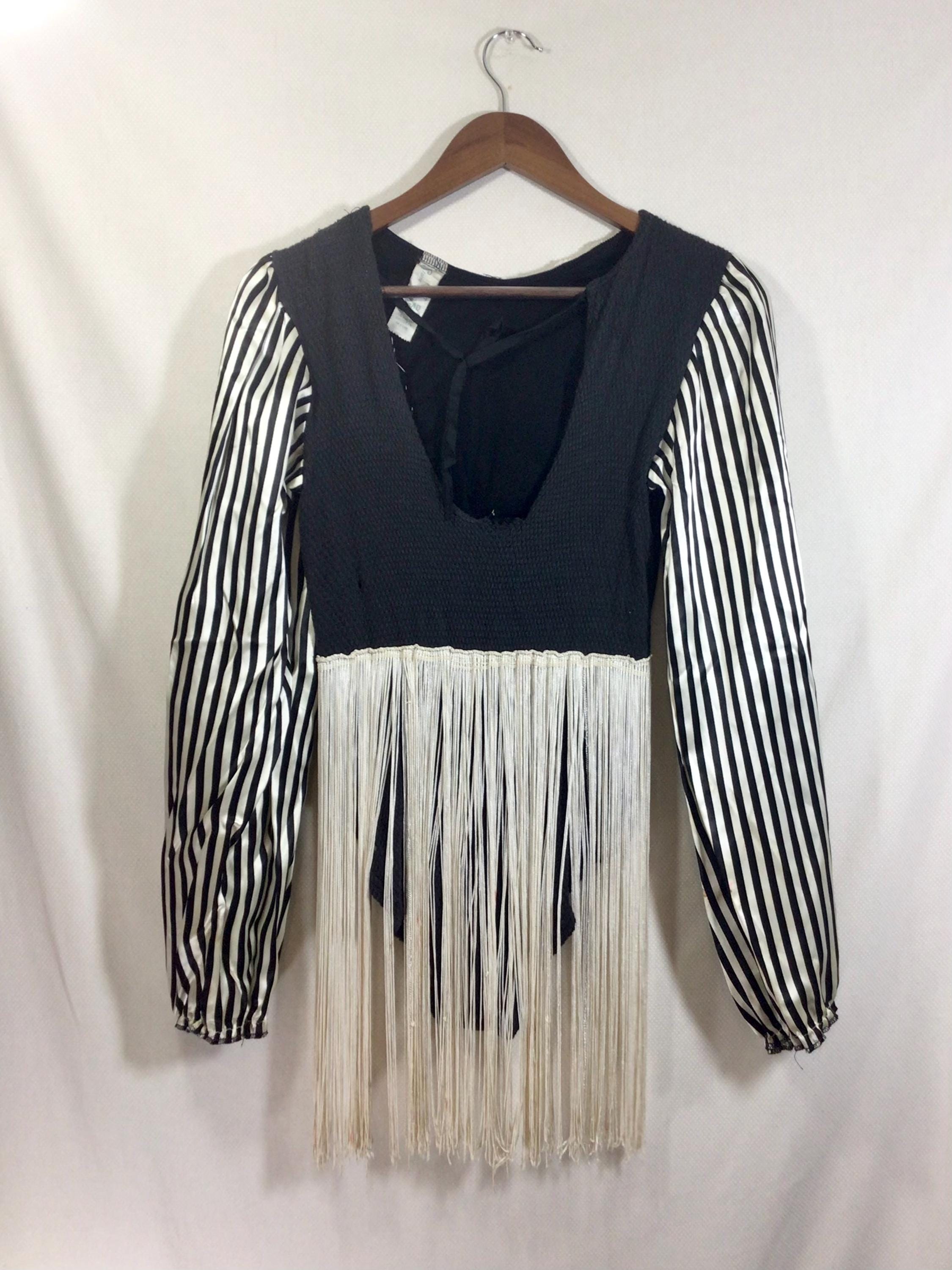 The front of the leotard has an amazing black and white striped bib neckline with the cutest little bowtie! The striped fabric continues on the sleeves, while the contrasting fringe shows off movement in a playful way. This would be an excellent piece for a Halloween/Theater/Burlesque costume, or simply for display!