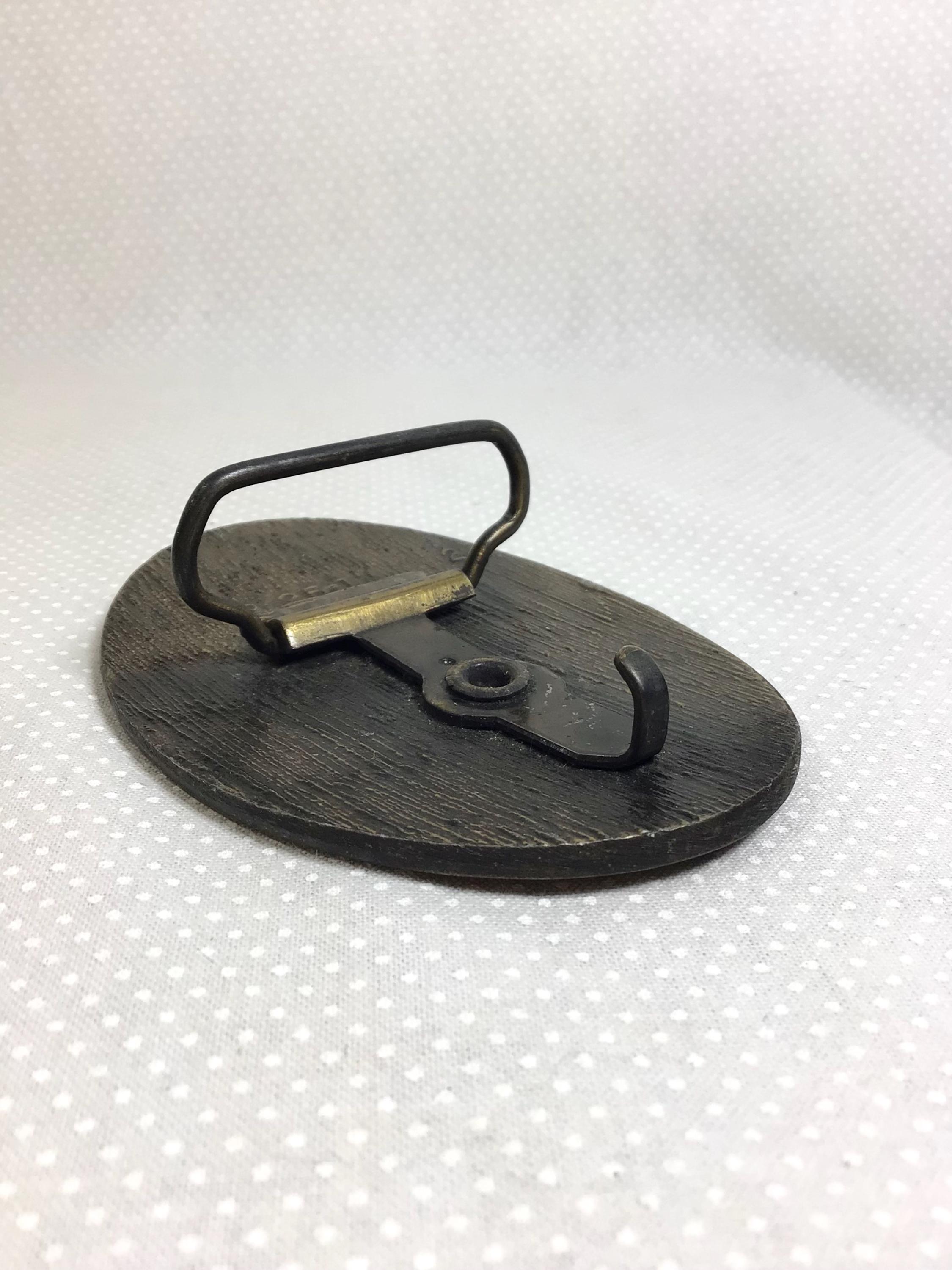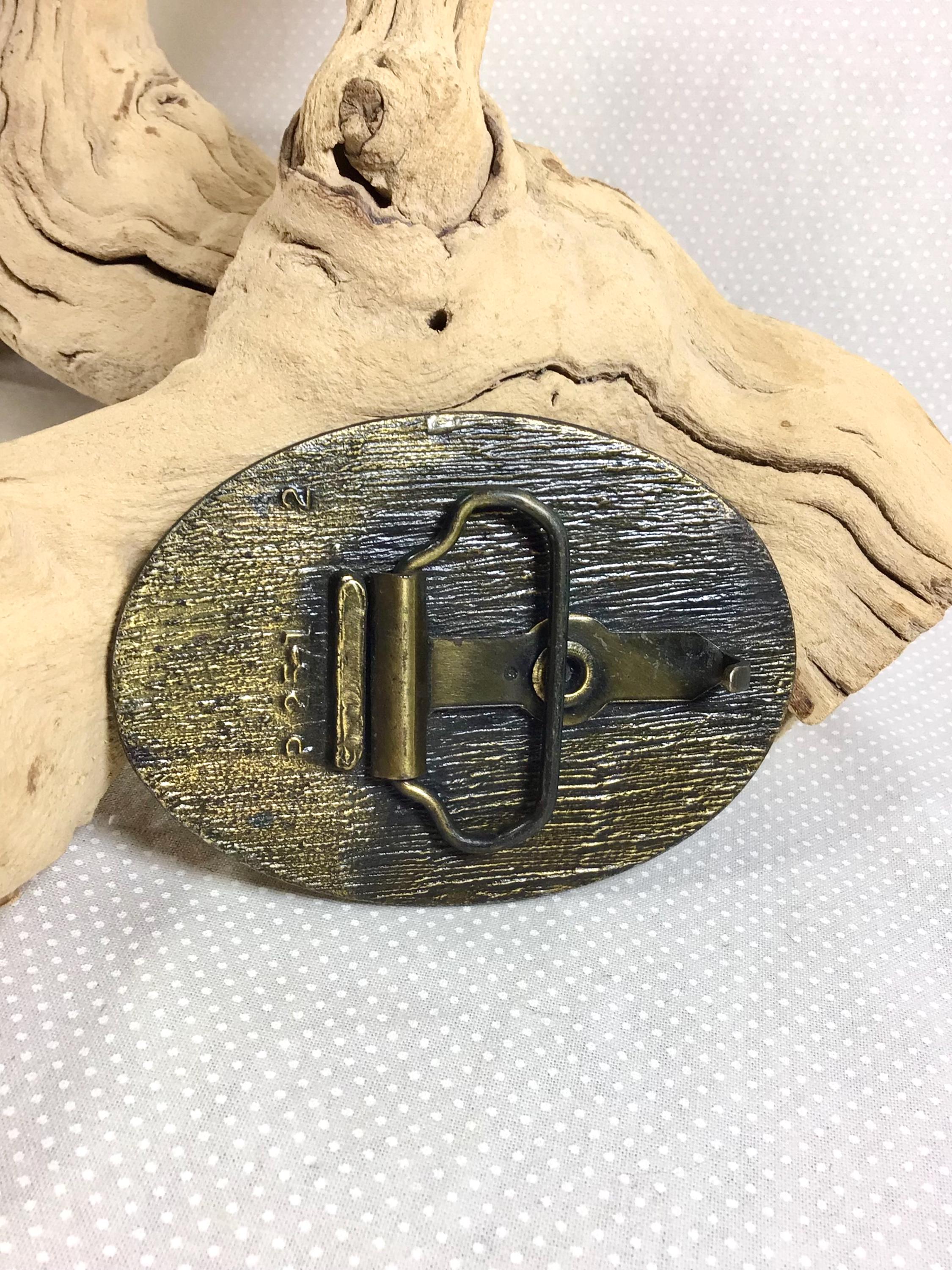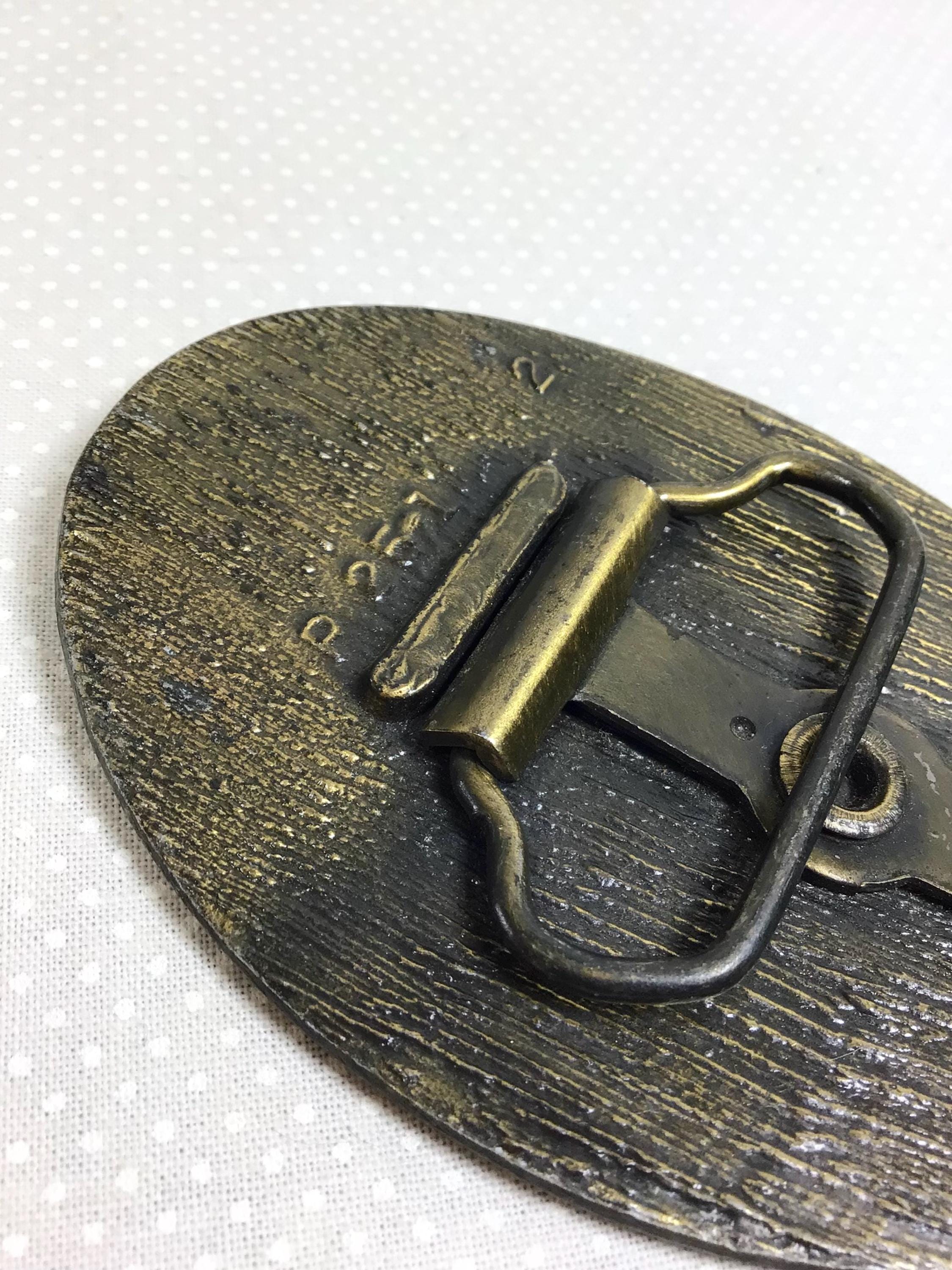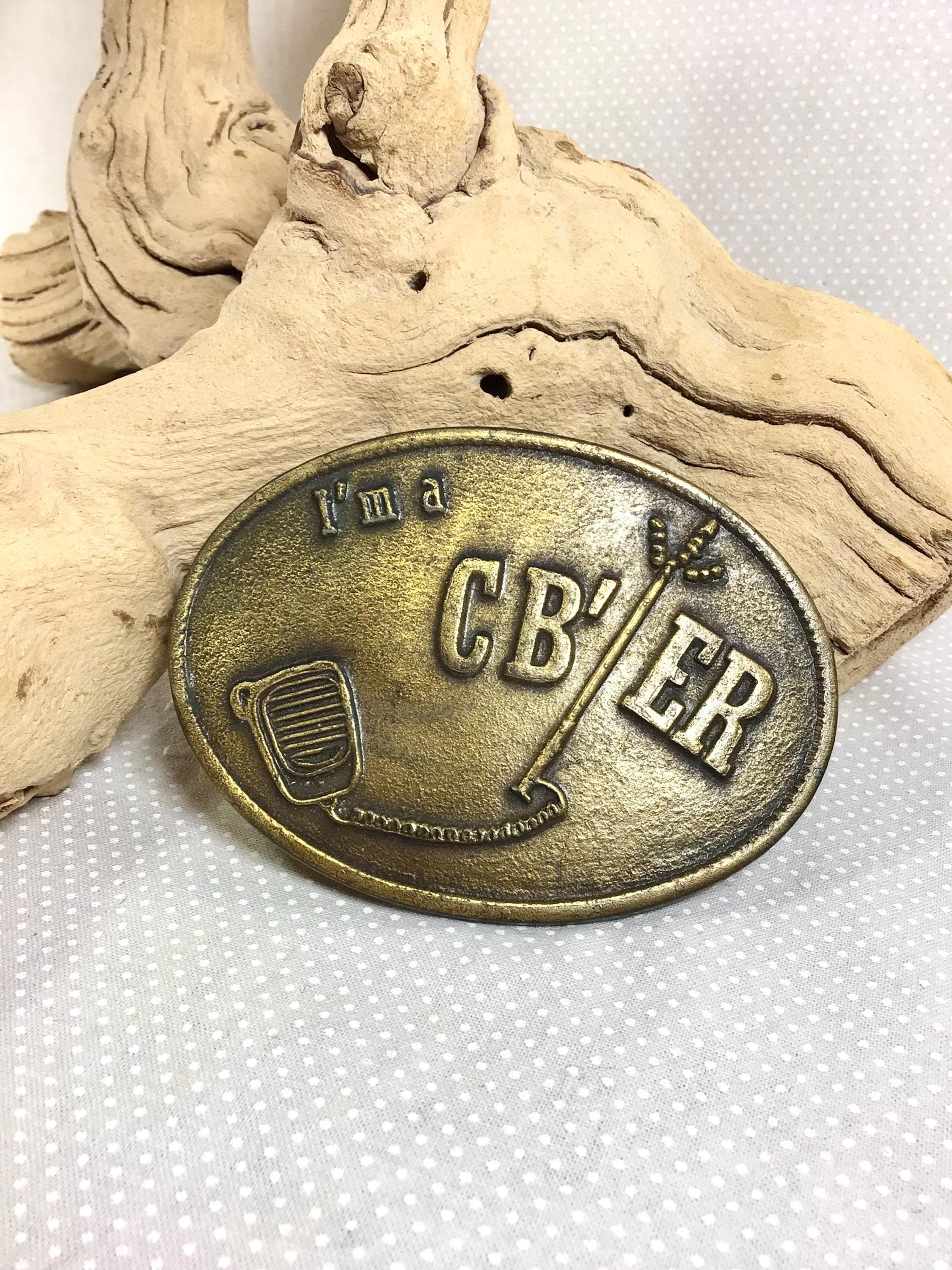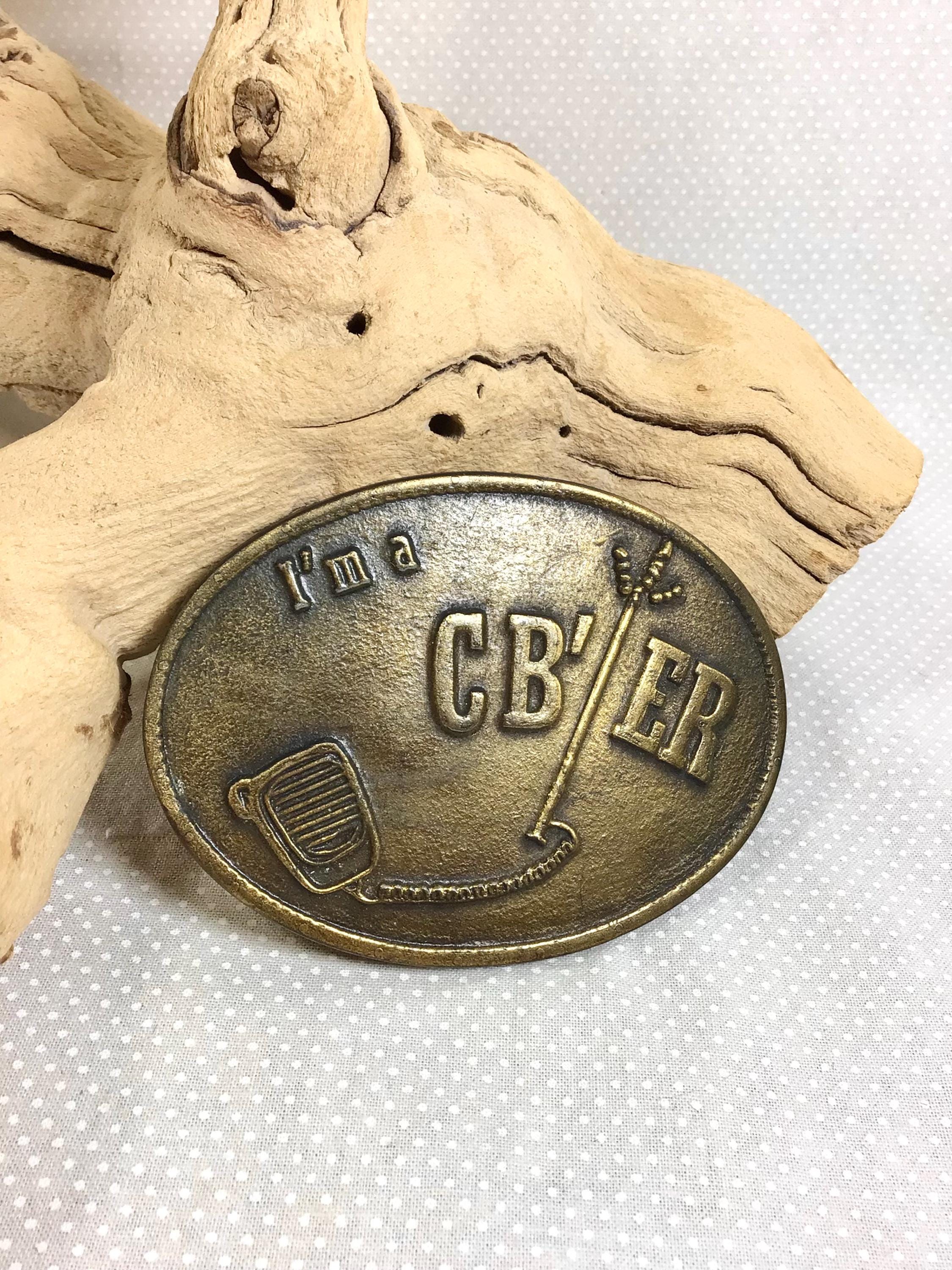 This buckle is made of solid brass with an antique finish. It has cool embossed details that say “I’m a CB’er”, with a cb radio. The buckle measures 3.25” by 2.5” and it would best fit a 1.5” belt.