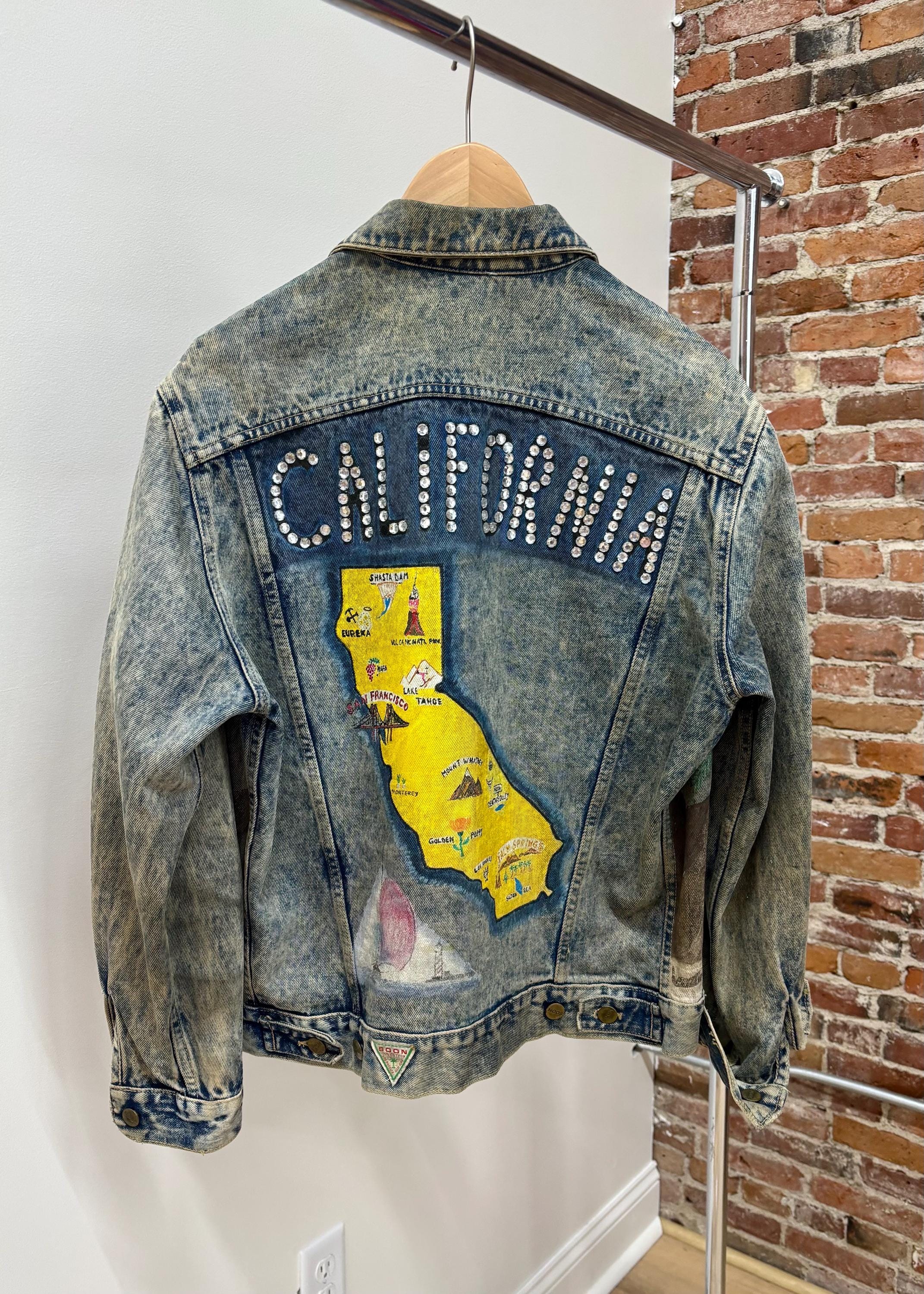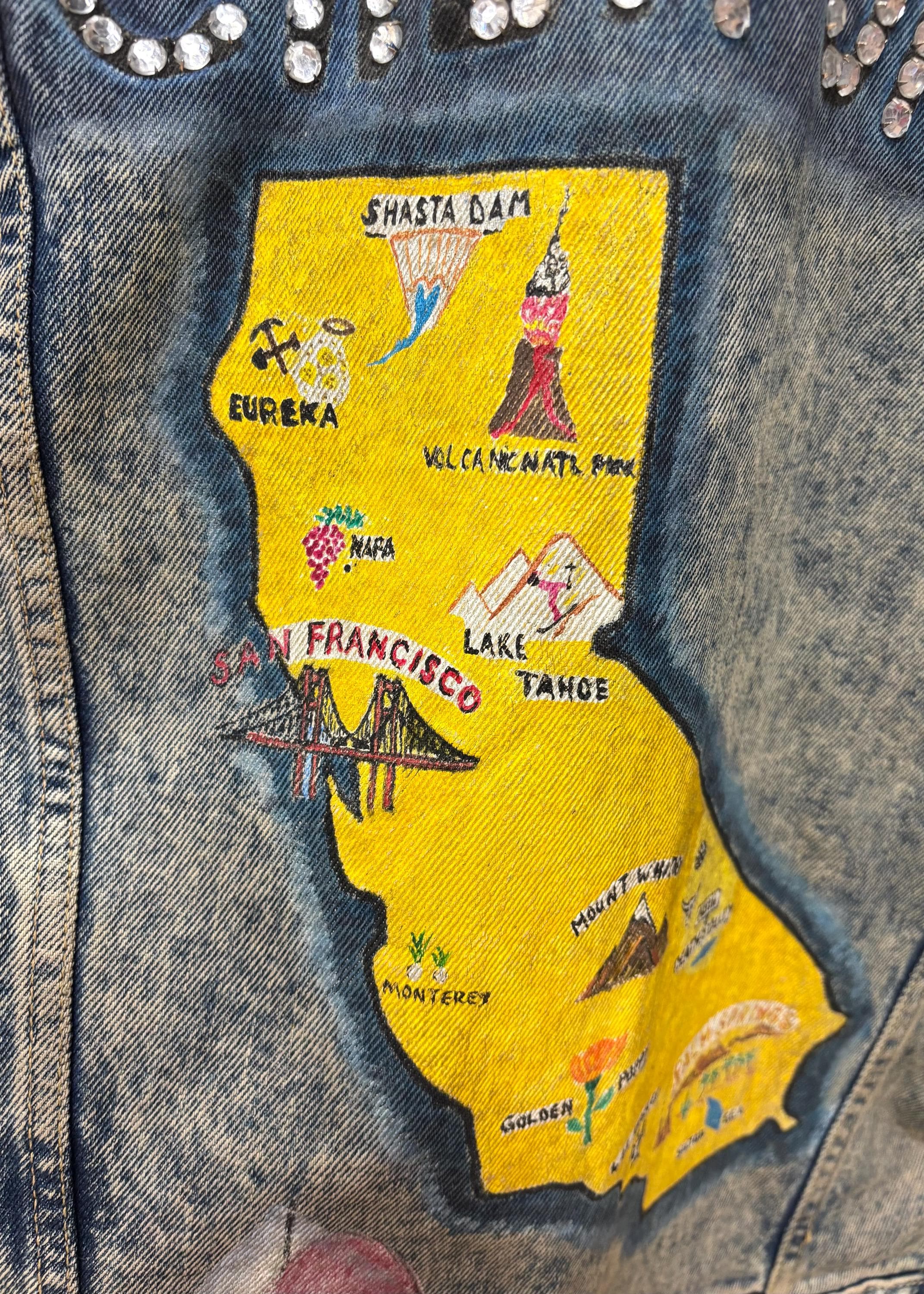 The details on this jacket are so awesome in person! The front has a palm tree and cacti against a desert landscape with rhinestones. Concho adornments and other fun surprises can be found throughout the jacket. The back side has an cool hand painted map of California, a sailboat, and the word “CALIFORNIA” in rhinestones.