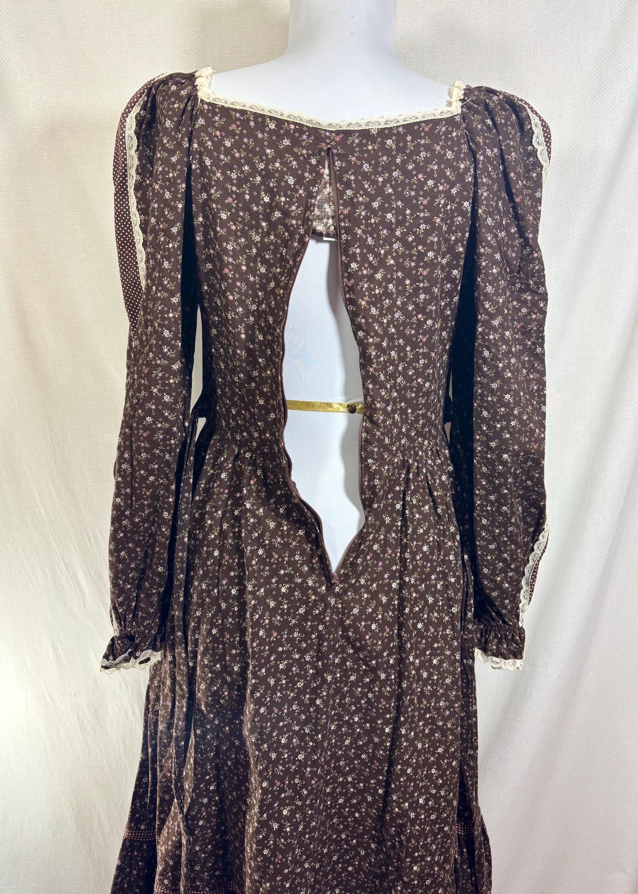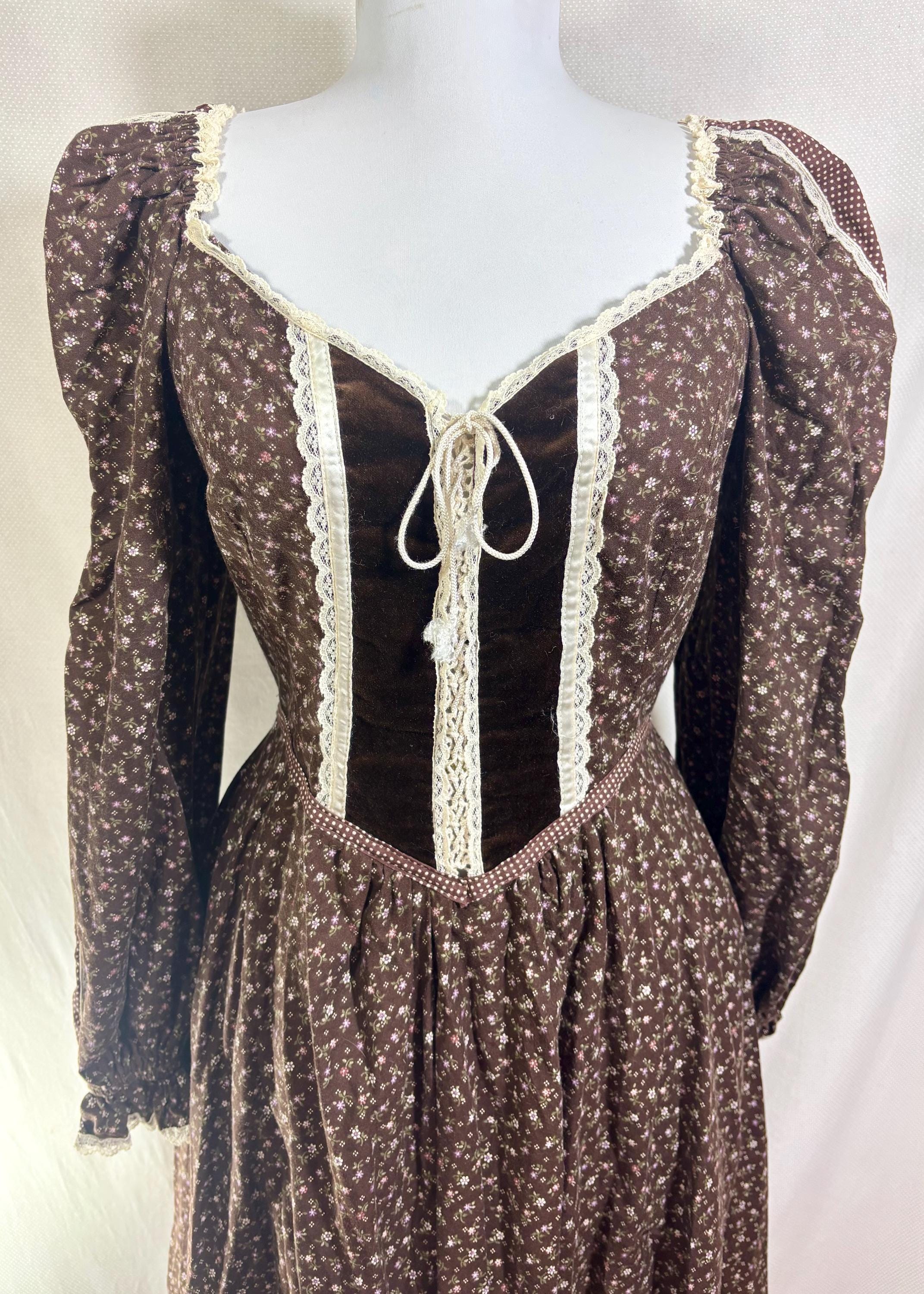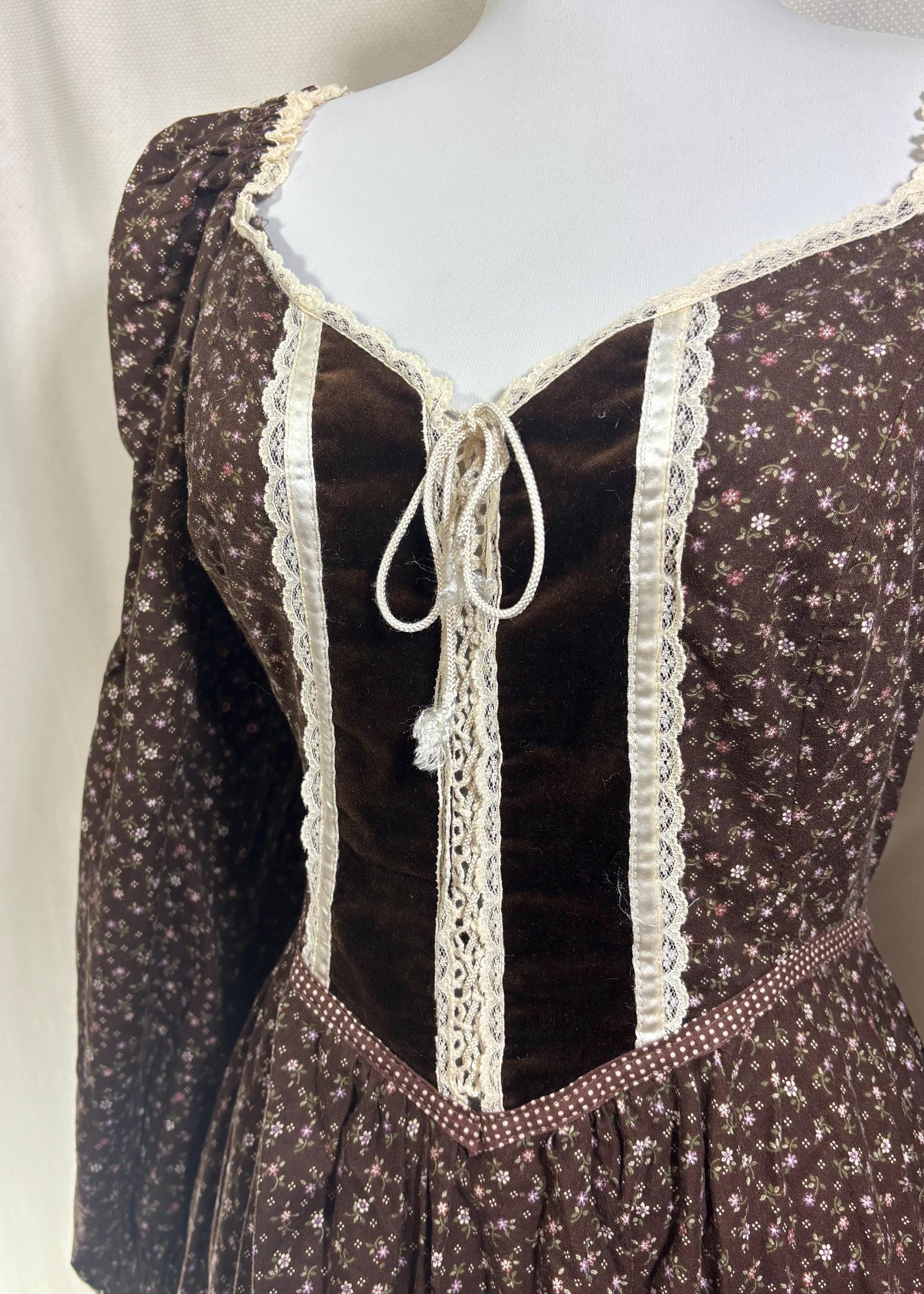The corseted bodice on this dress is trimmed with a rich brown velvet, white lace, and polka dot ribbon.