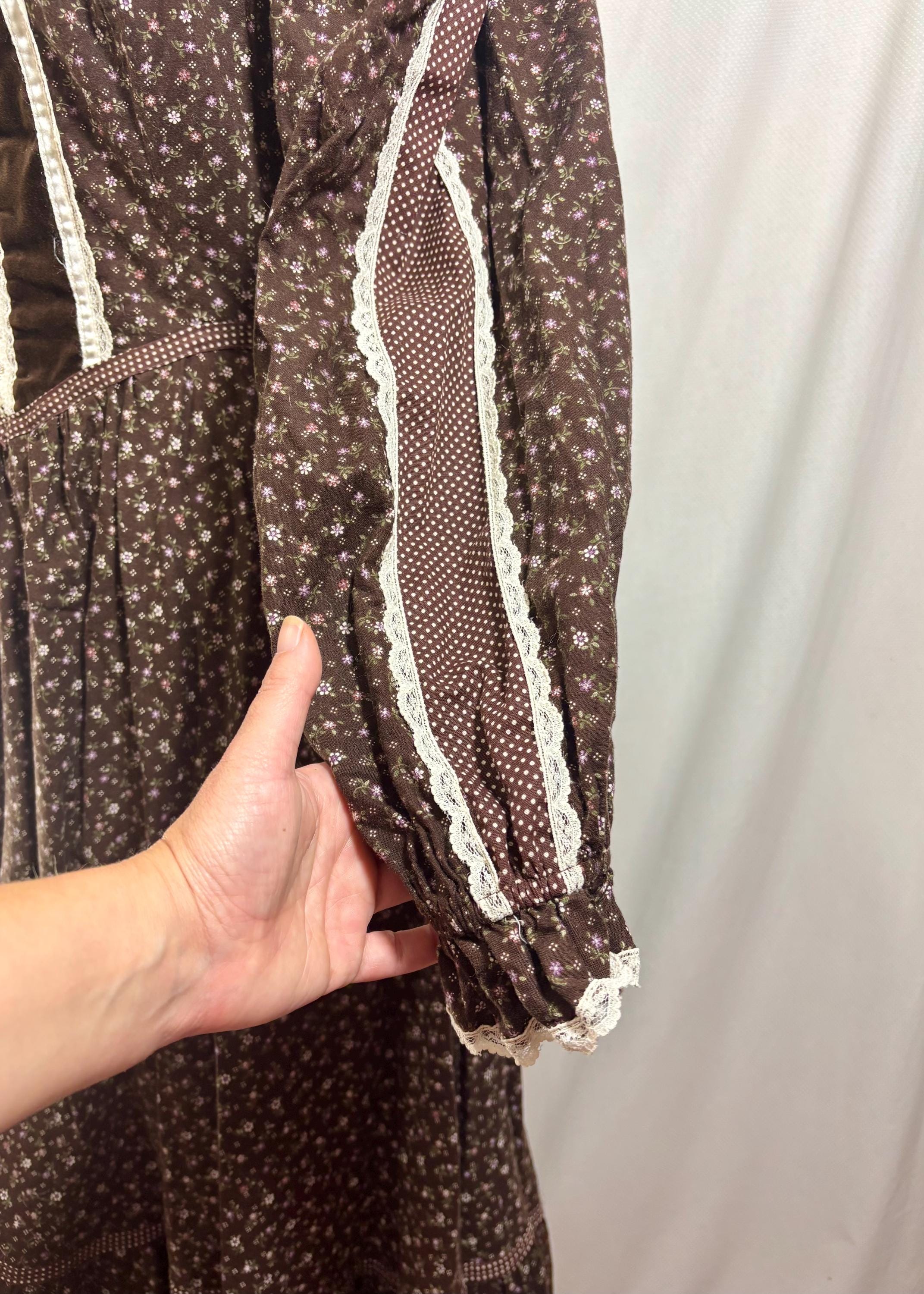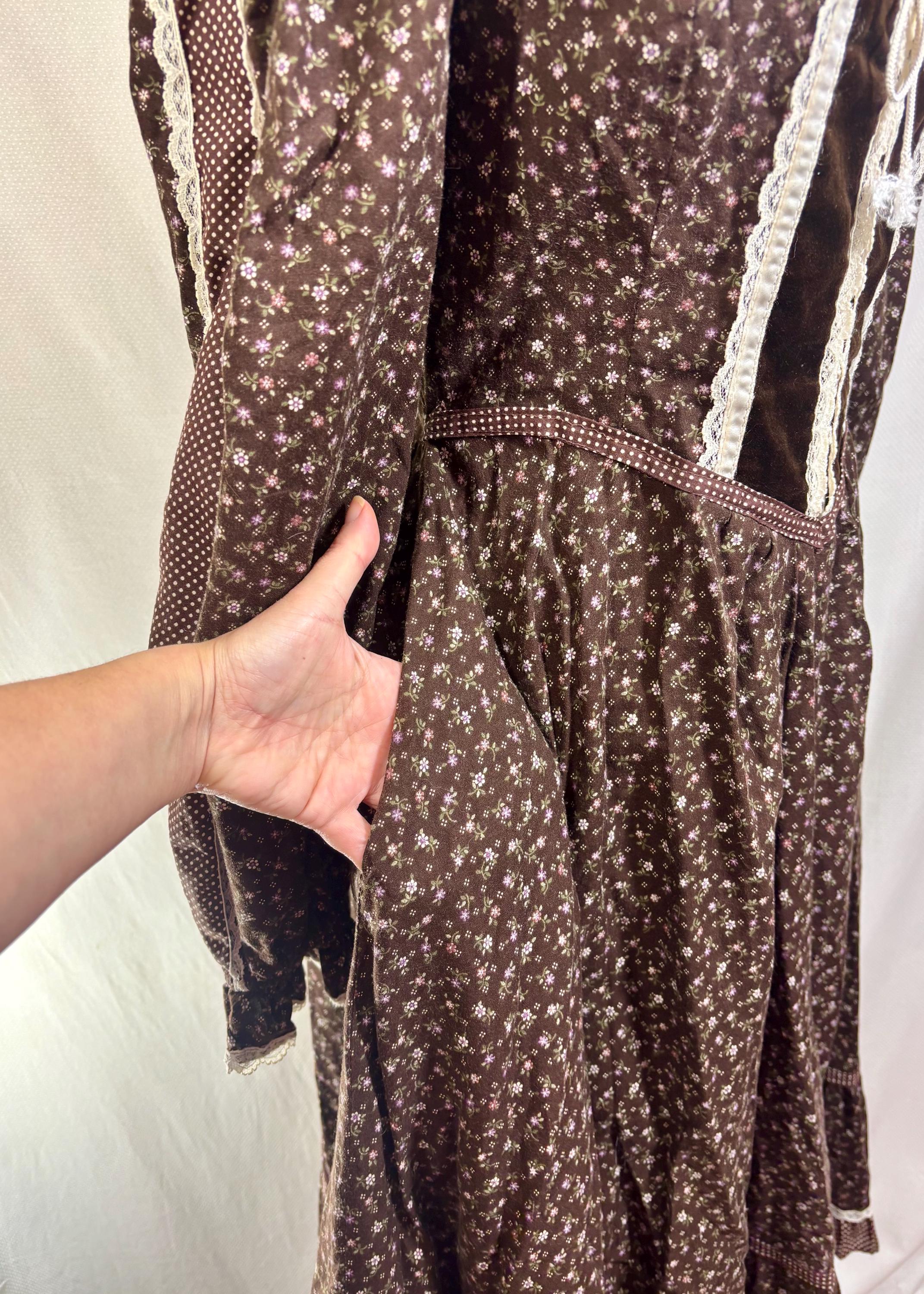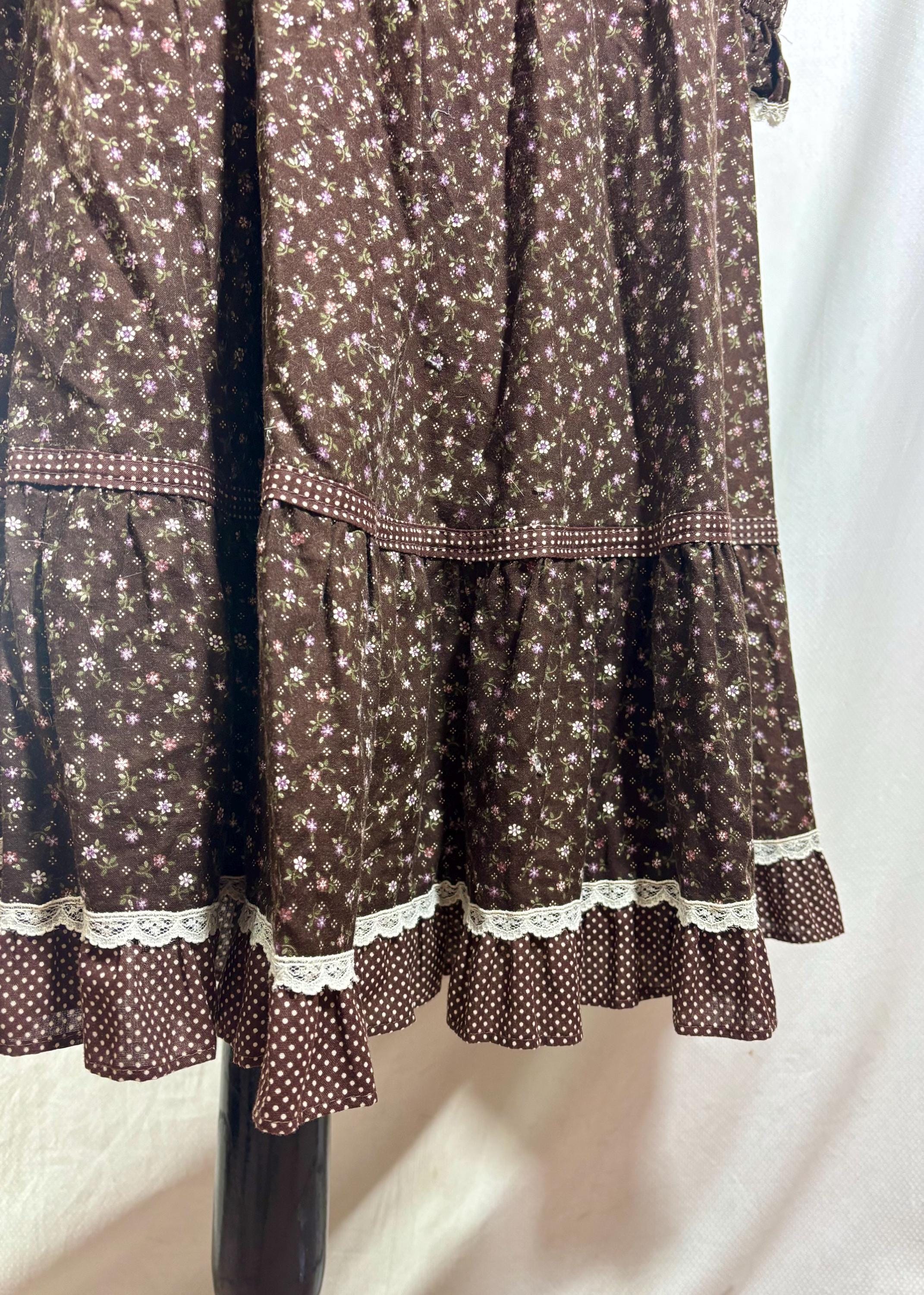 The corseted bodice on this dress is trimmed with a rich brown velvet, white lace, and polka dot ribbon.