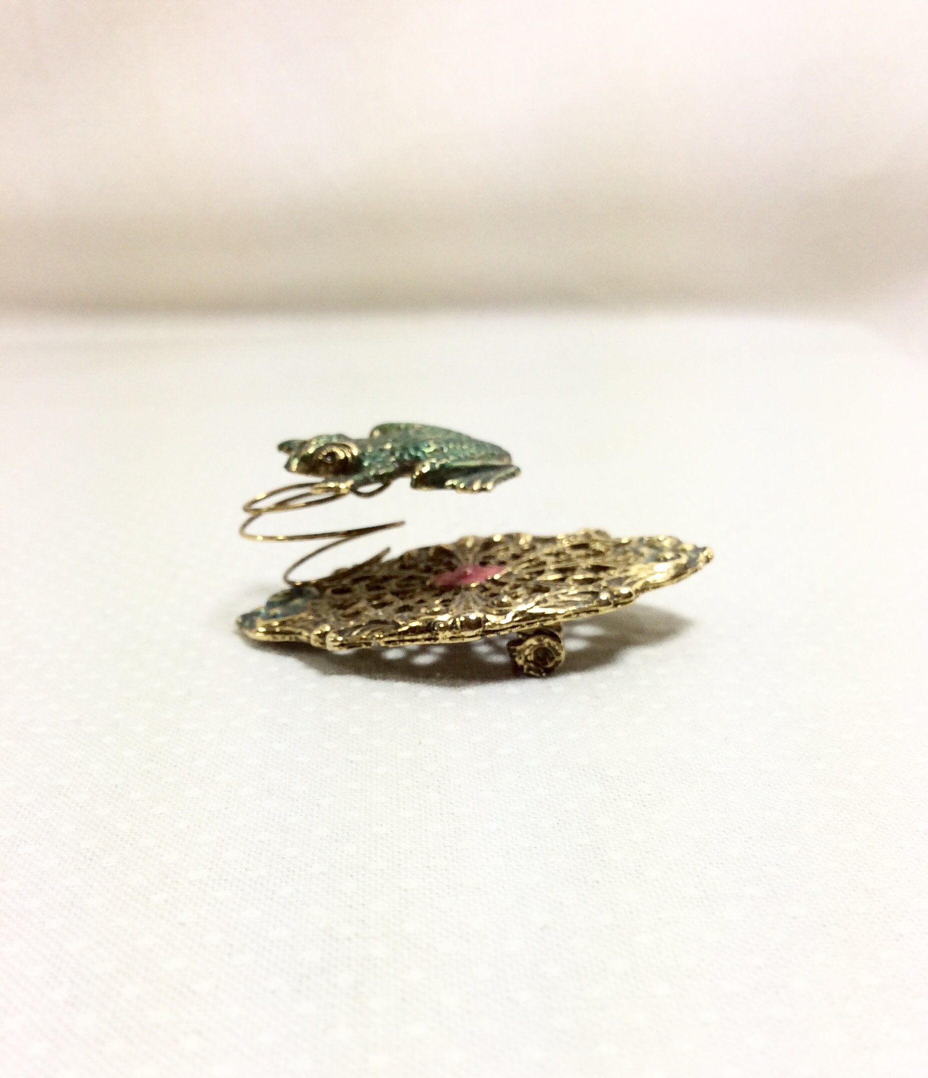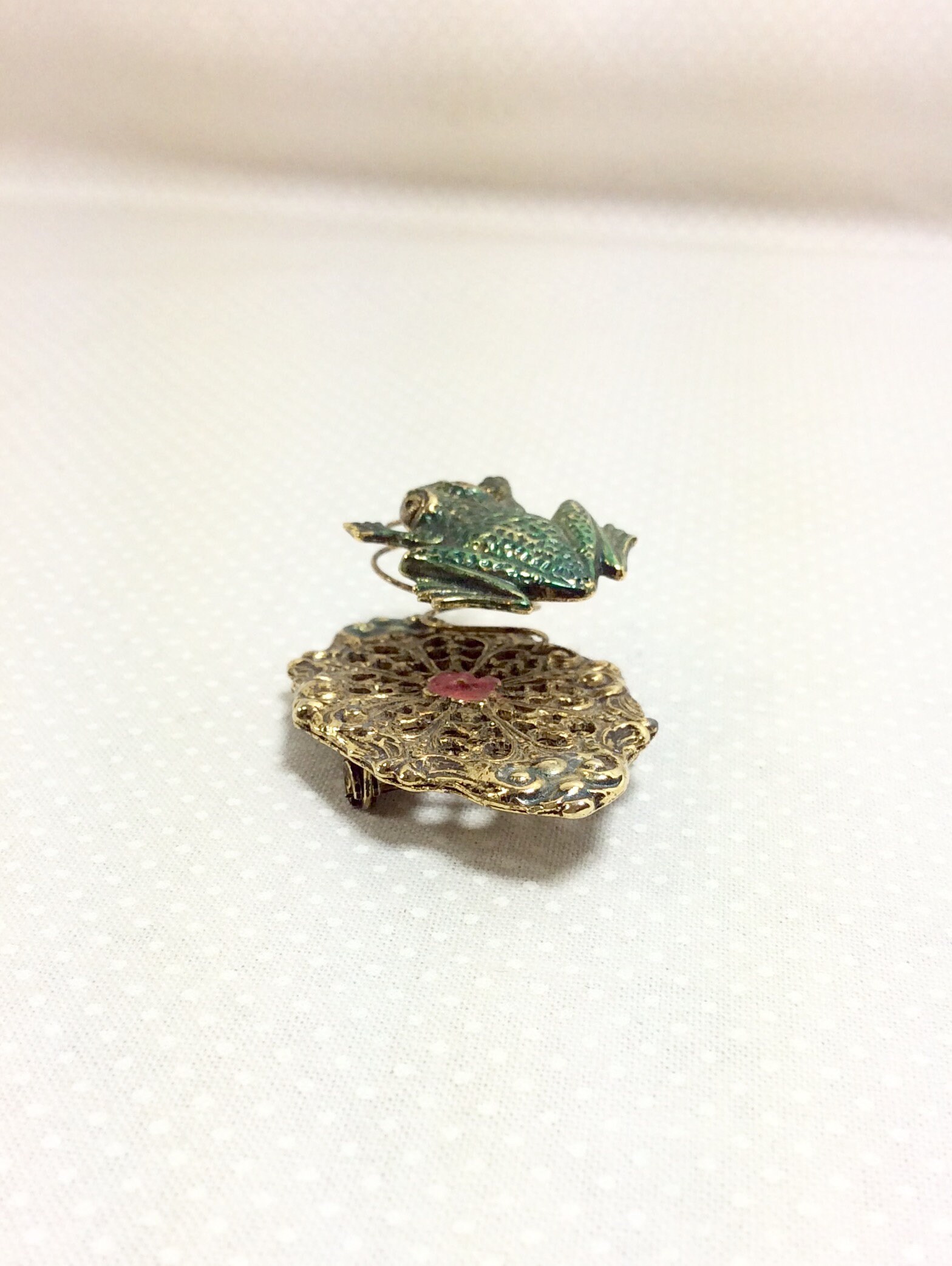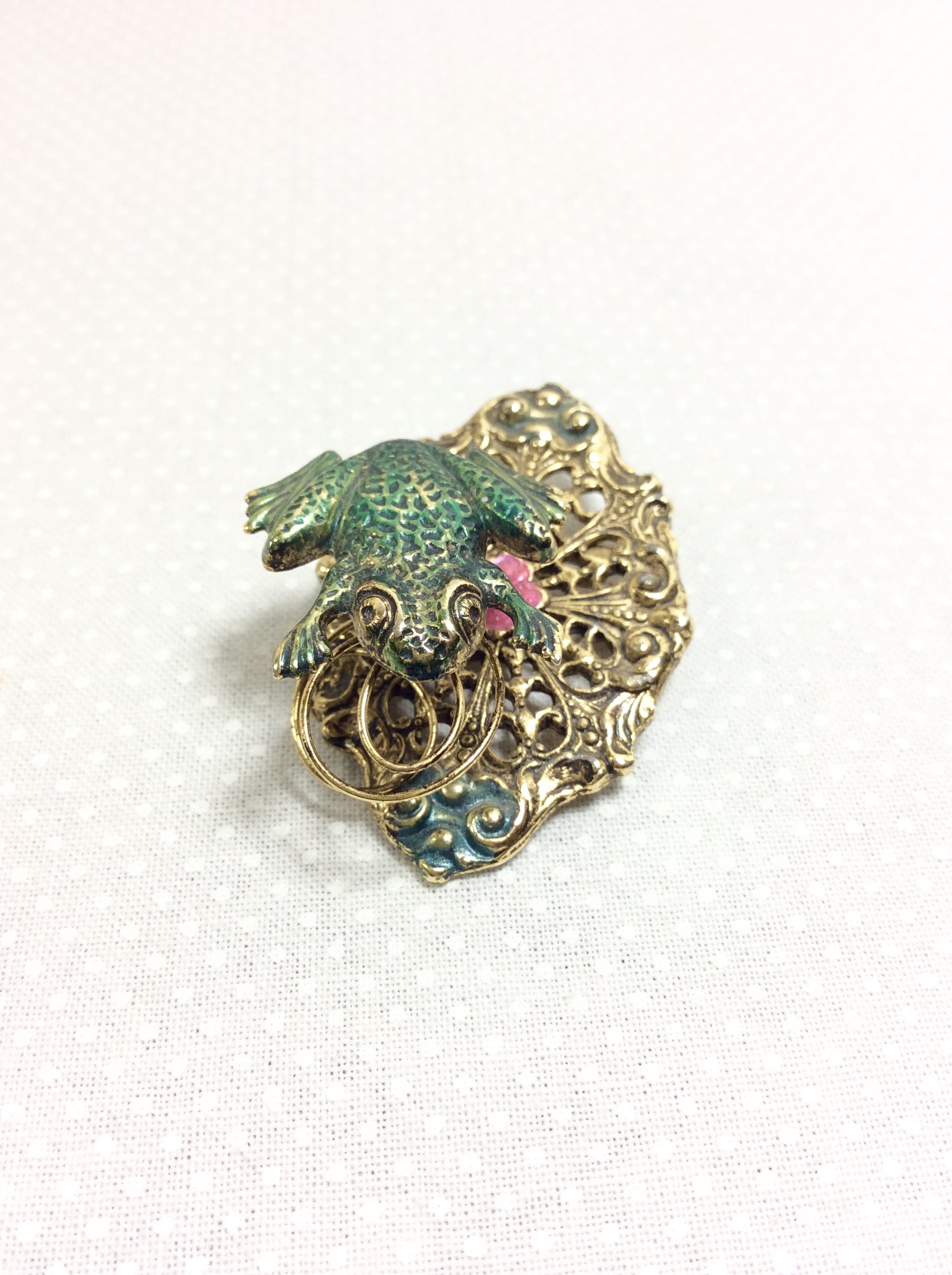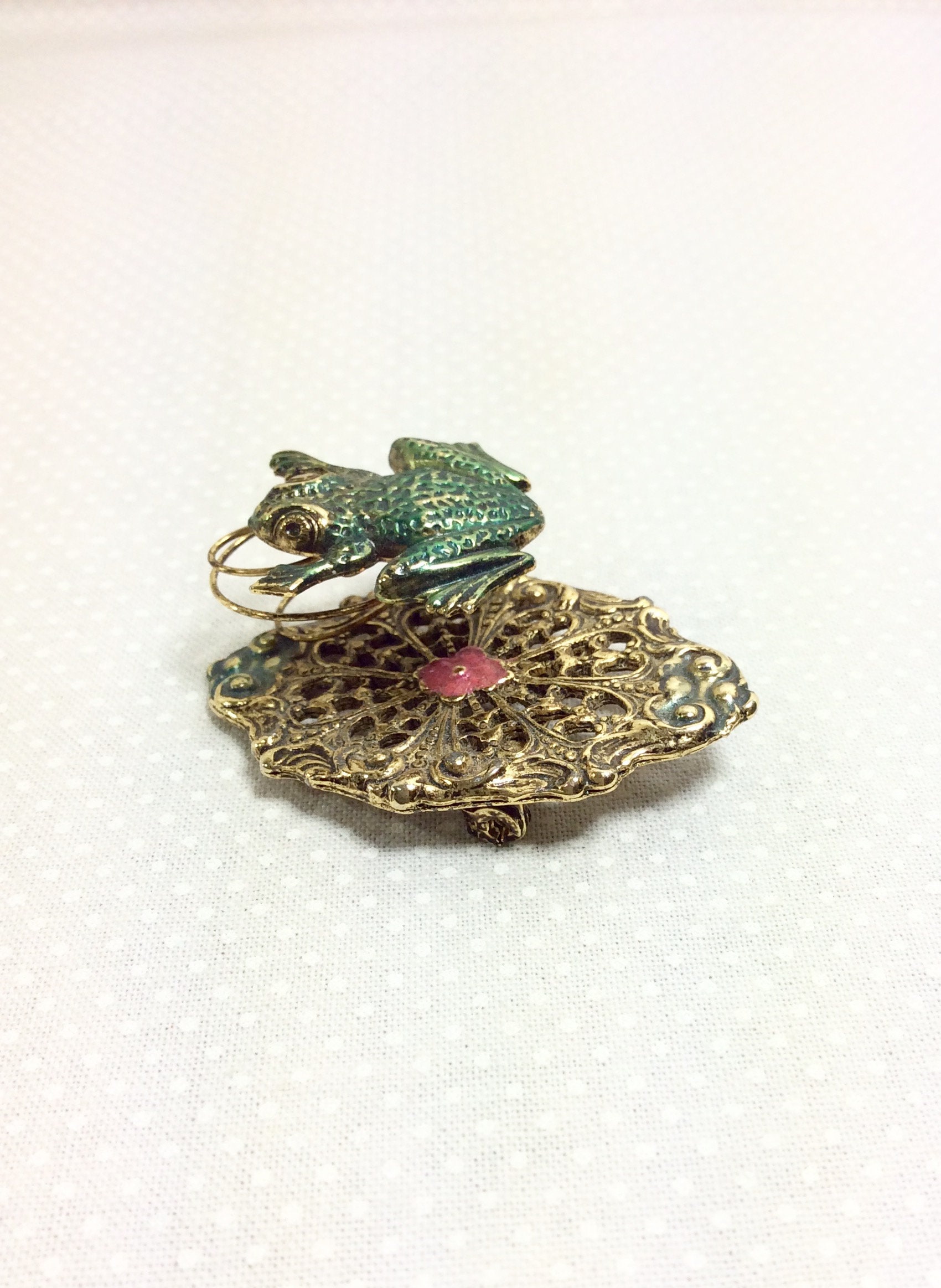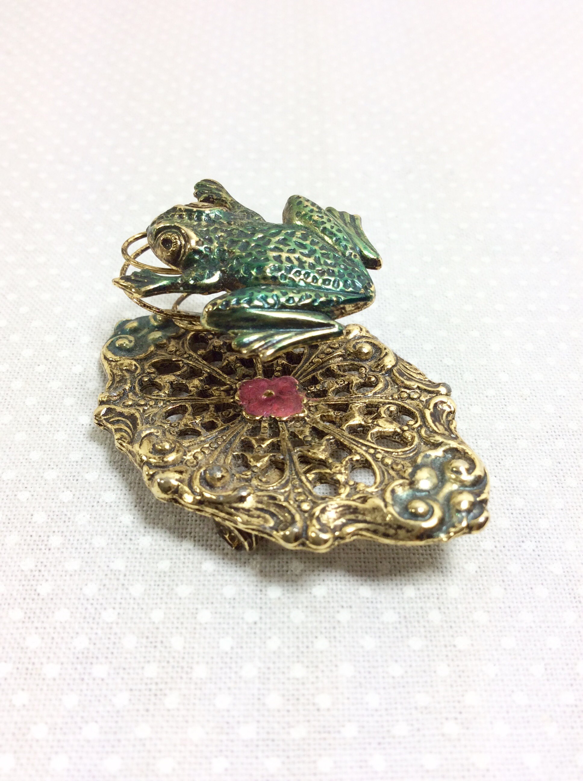The textures and small details on this brooch are quite lovely. The base of the brooch is an oval shaped brass lilly pad with pretty floral filigree. There is is small pink painted flower in the center for an extra bit of cuteness! A little jumping green frog is attached to the base with a wire coil. The coil allows the frog to move and wiggle with movement, making this a fun interactive piece of jewelry! It would be a great gift for the frog lover in your life, or could be a fabulous costume piece!