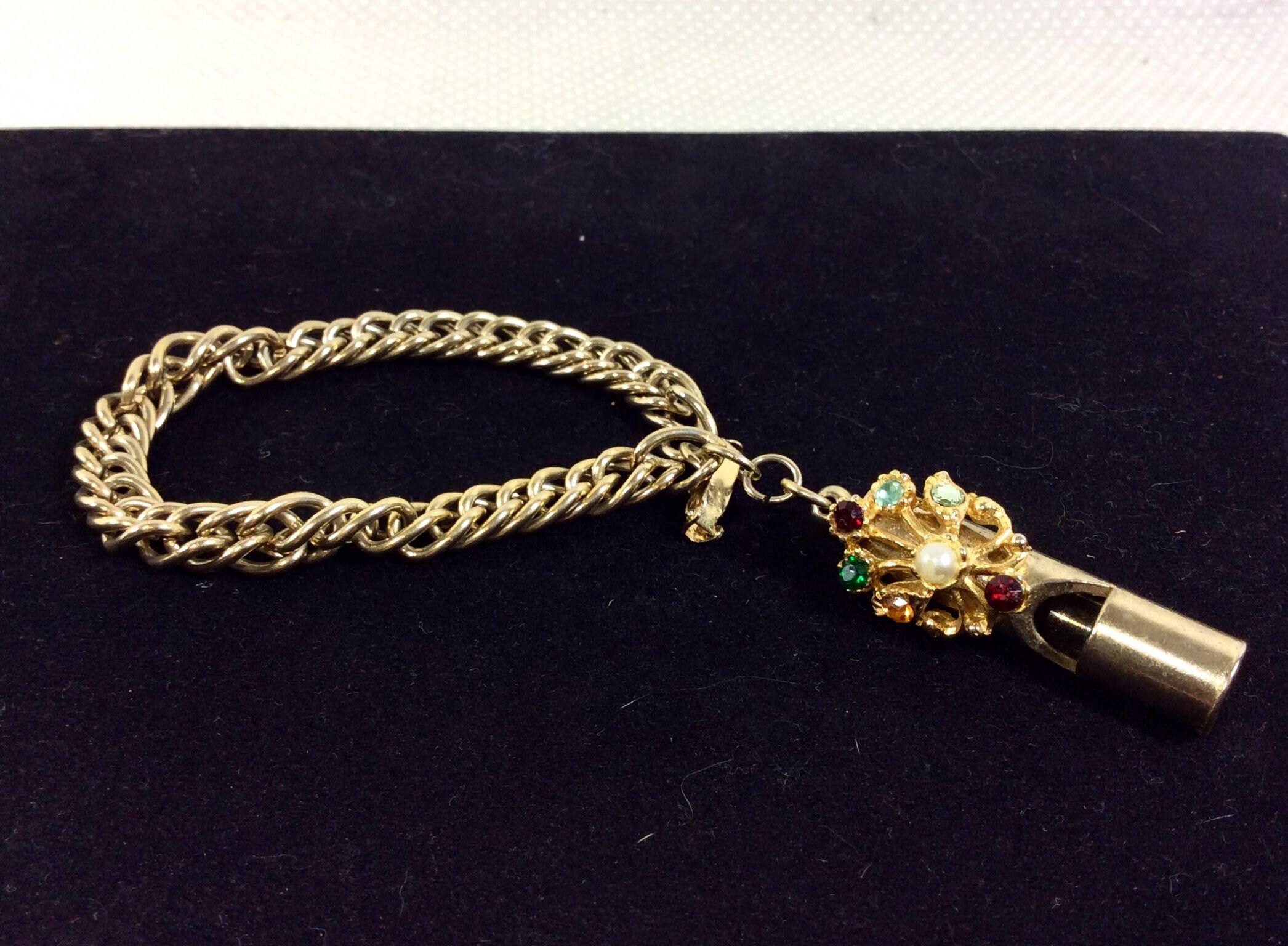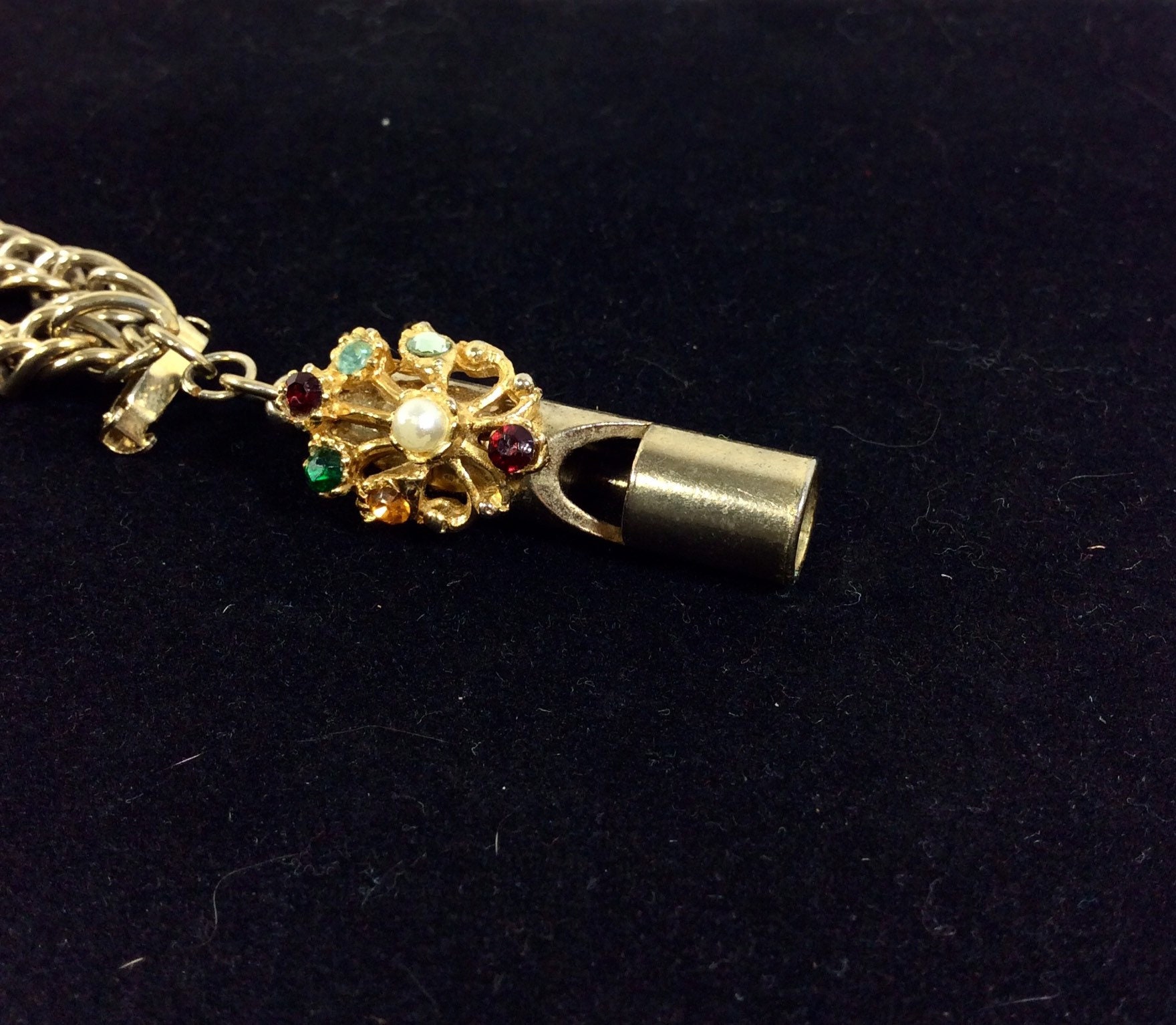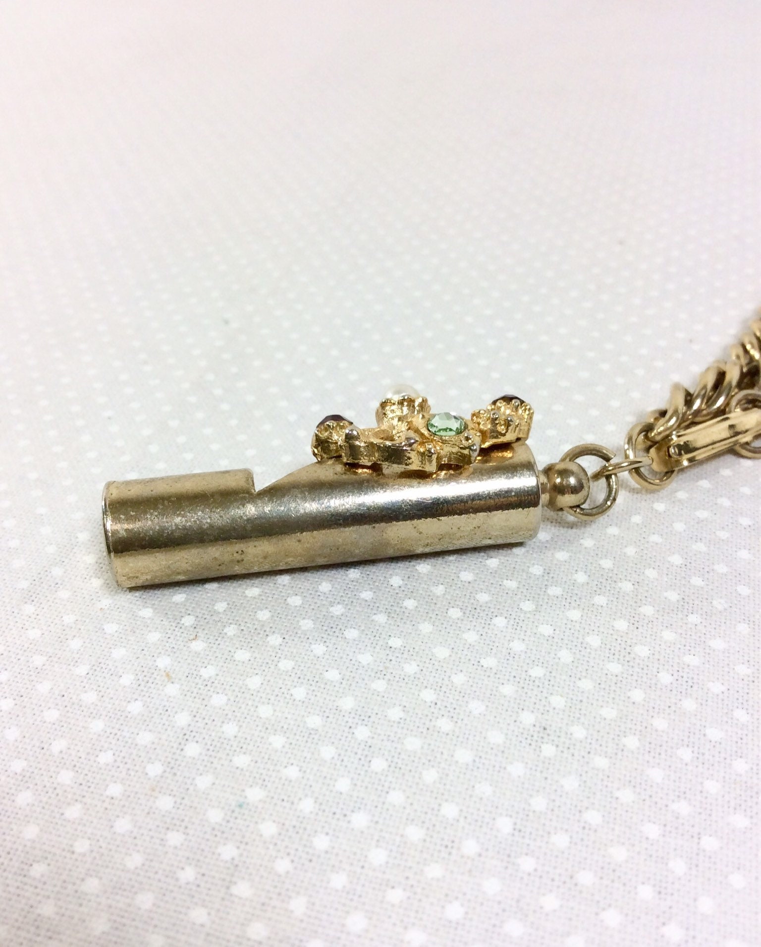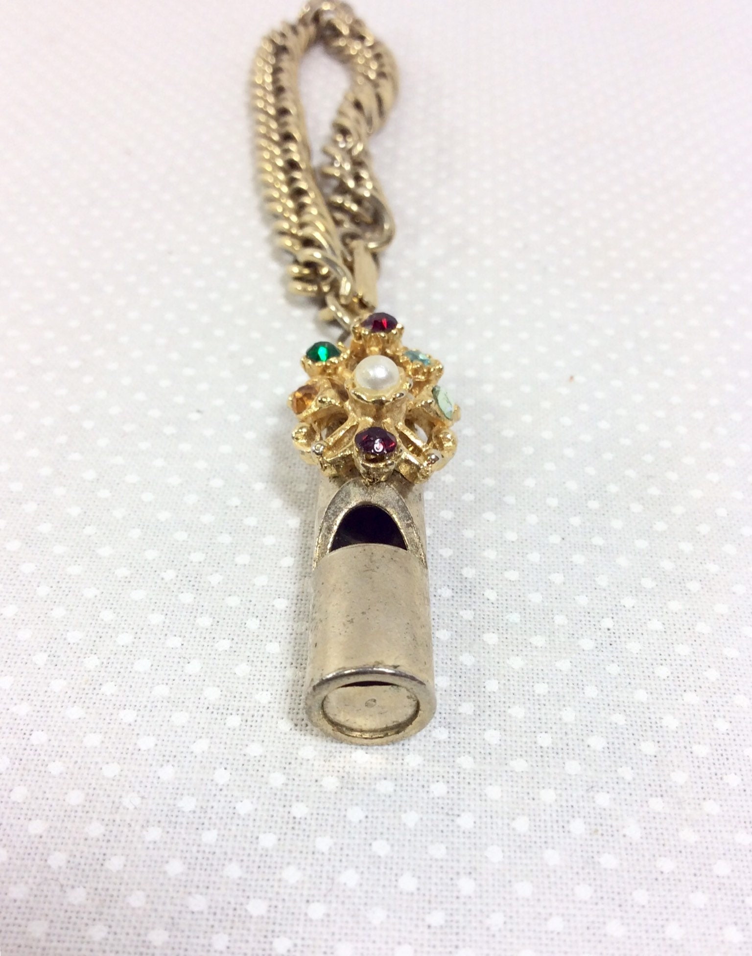 The star of this piece is definitely the whistle charm! The whistle itself is made of brass, and measures 1.5 inches long. A decorative cluster adorns the top of the whistle. Tiny rhinestones and a small faux pearl are set into a textured gold plated filigree piece. There are a variety of colored rhinestones- seafoam green, citrine, ruby red, and deep green. The whistle works nicely and lets out a clean and pretty sound that is audible for both human an animal ears.