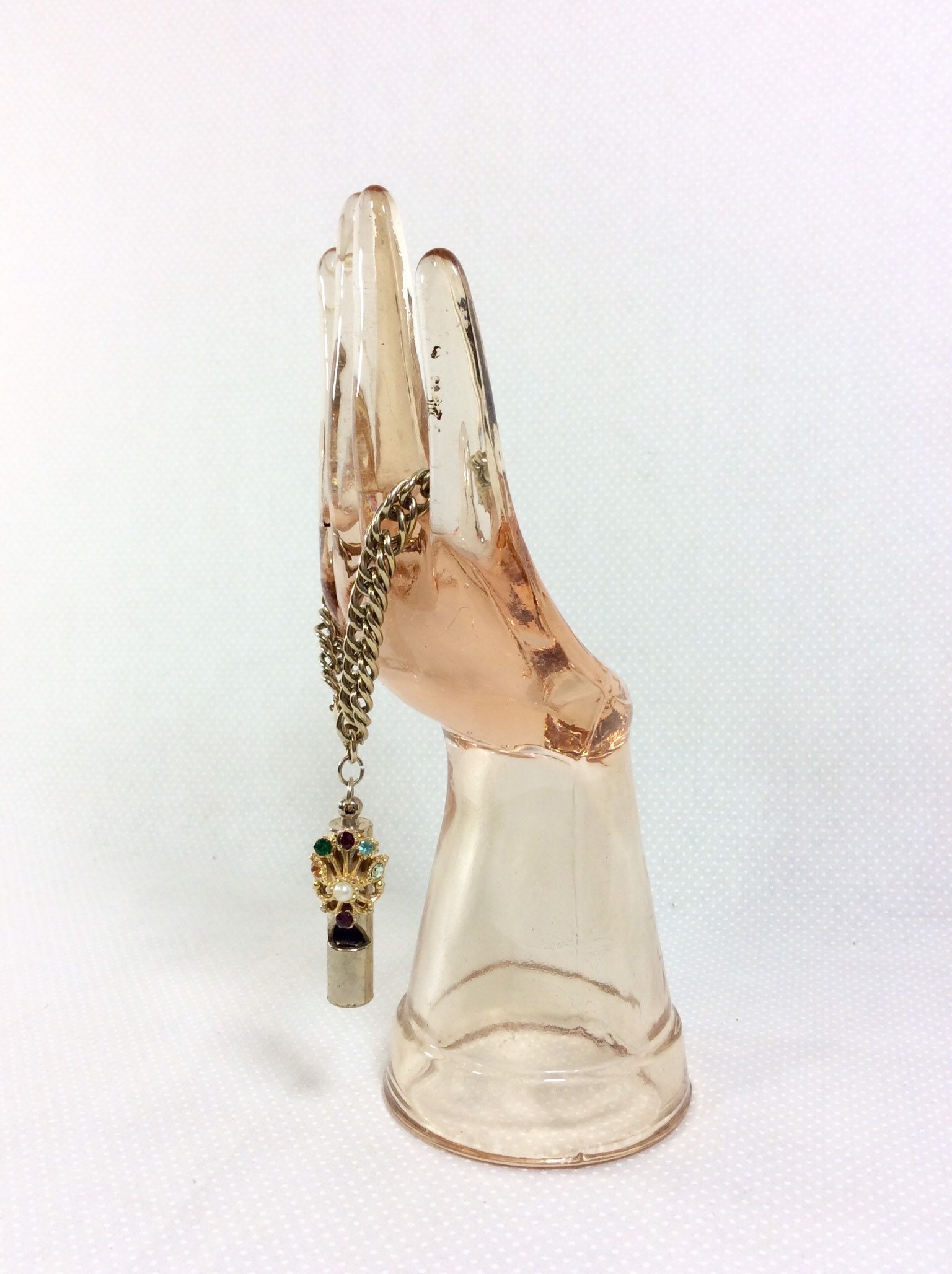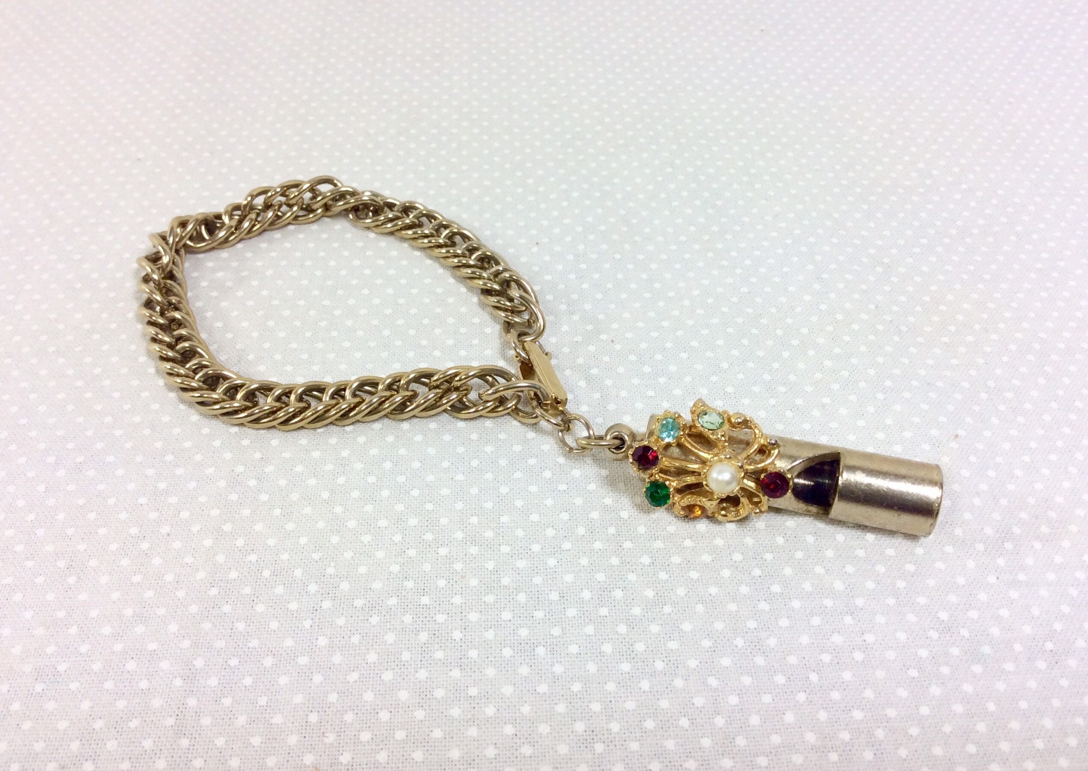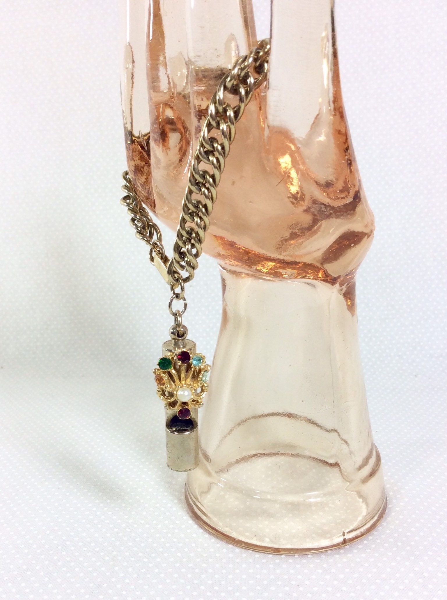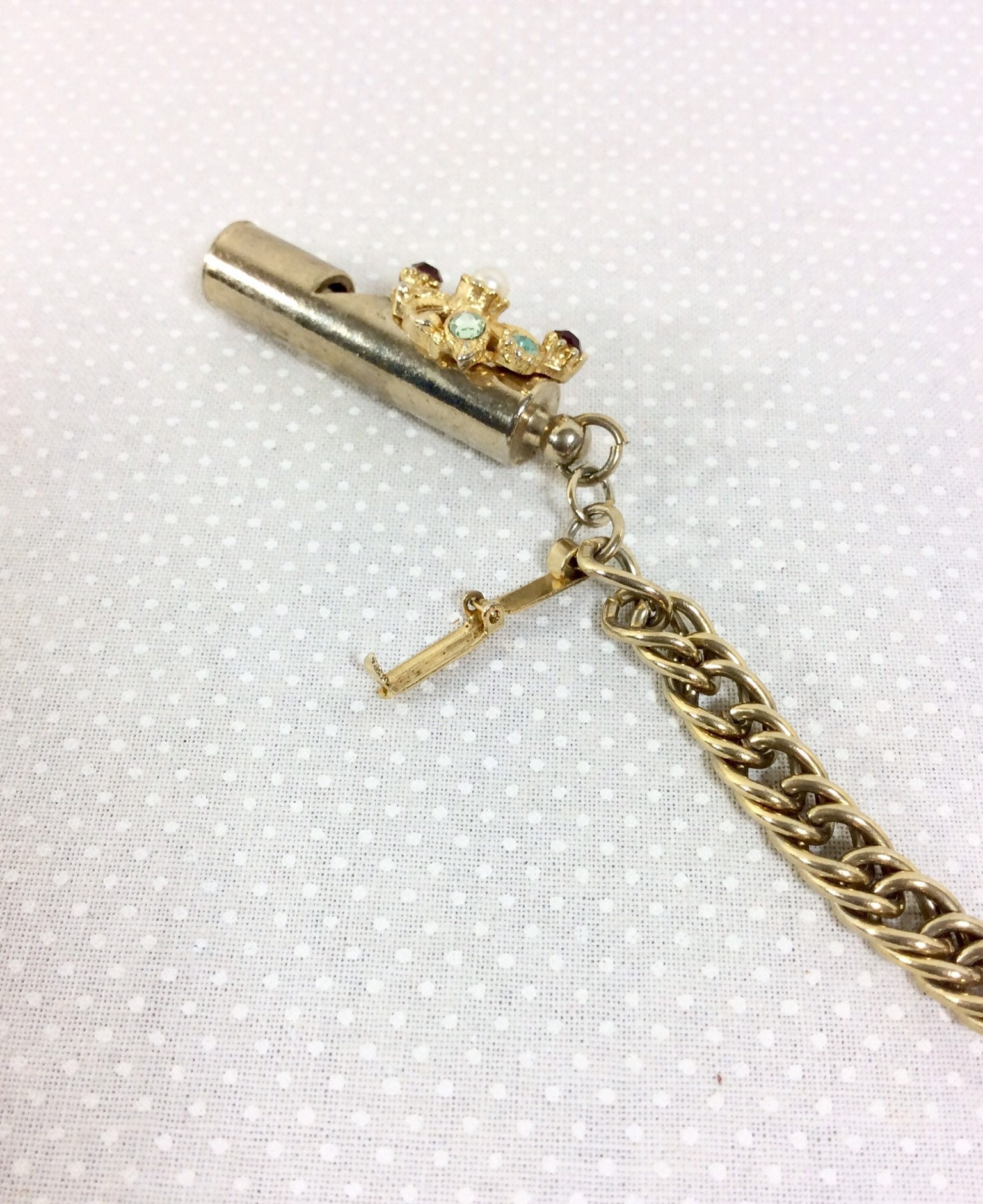 The star of this piece is definitely the whistle charm! The whistle itself is made of brass, and measures 1.5 inches long. A decorative cluster adorns the top of the whistle. Tiny rhinestones and a small faux pearl are set into a textured gold plated filigree piece. There are a variety of colored rhinestones- seafoam green, citrine, ruby red, and deep green. The whistle works nicely and lets out a clean and pretty sound that is audible for both human an animal ears.